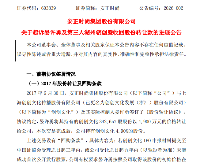 近日,安正时尚集团股份有限公司(证券代码:603839,以下简称“安正时尚”)采取了一项重要的法律行动,正式通过诉讼方式向晏许勇及第三人湖州瓴创企业管理合伙企业(有限合伙)追偿股份转让款。2026年1月12日,上海市长宁区人民法院已正式立案受理此案。这起诉讼标志着一起始于2017年、涉及4900万元股权投资附回购条件的交易,在历经多次协商、展期与催收后,最终因对方持续违约而进入司法程序。