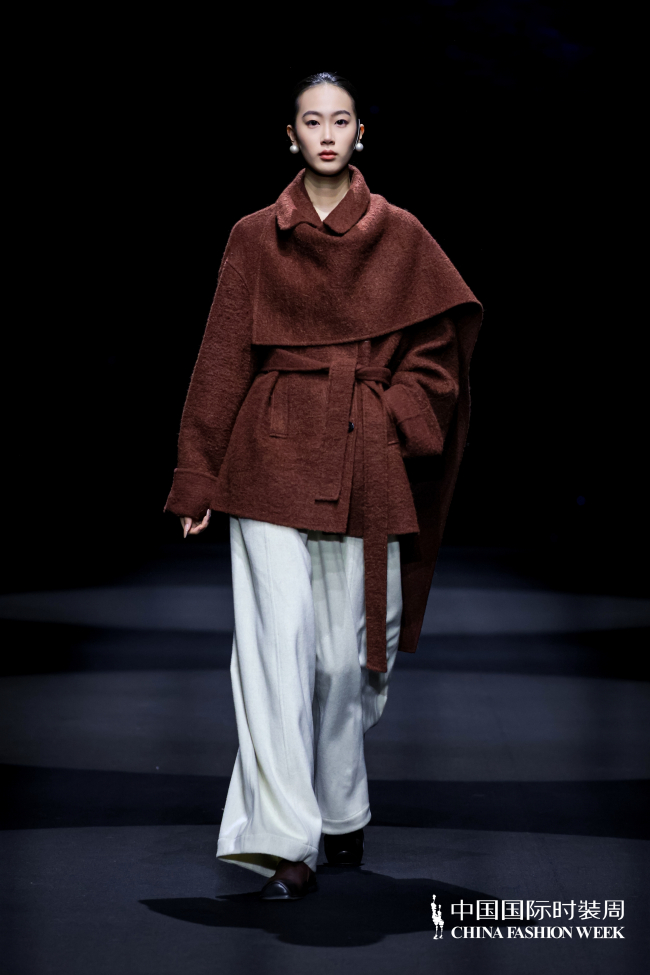 开场以纯净的云白色双面呢大衣定调“空”与“灵”,手工立体花朵在如开阔原野般的廓形上悄然绽放,辅以赤土红的刚毅与包容,于清冷质感中展现坚韧力量。