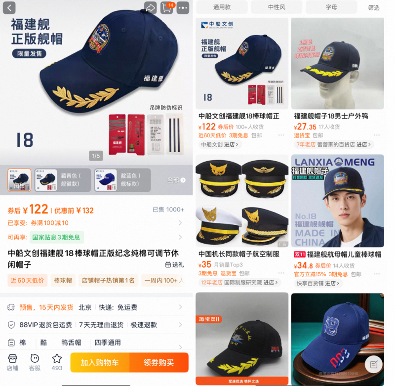 (图:福建舰入列后,淘宝上的商家推出不同款式的福建舰棒球帽)