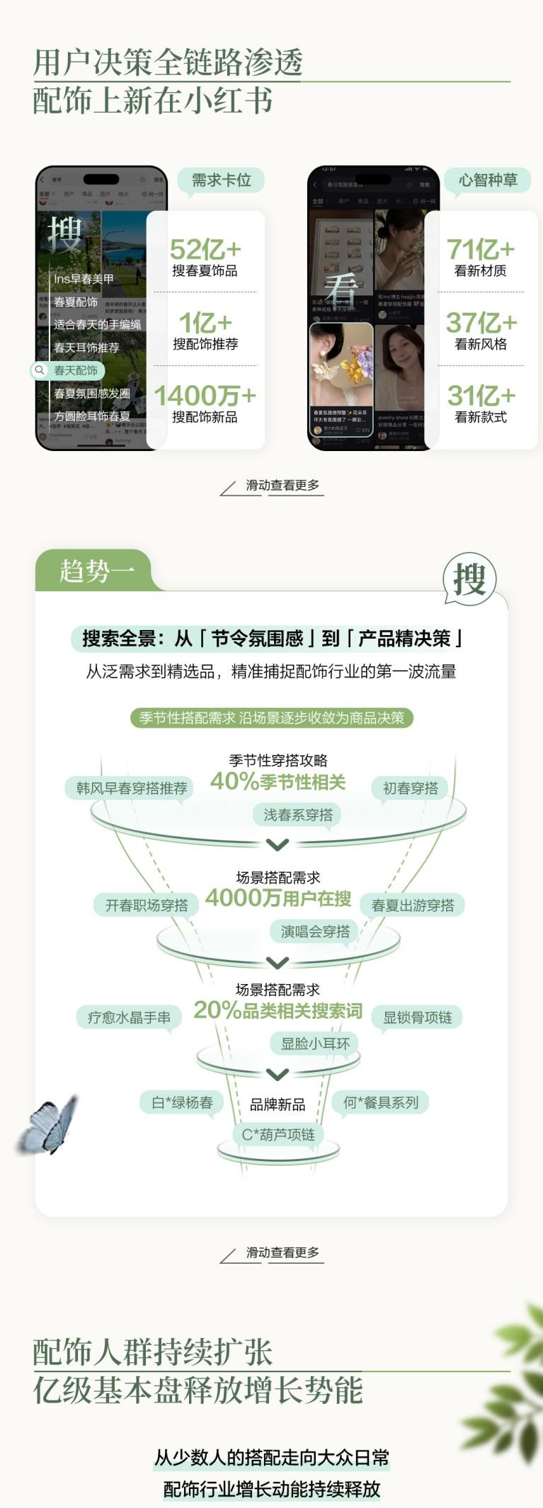 作为配饰消费决策的重要阵地与穿搭灵感策源地,小红书已成为年轻群体获取配饰趋势、沉淀搭配灵感、完成消费决策的首选平台。平台配饰兴趣人群持续扩容,同比增长30%,配饰消费也正从小众精致需求,逐步渗透进更广泛、更高频的日常生活,行业增长势能持续释放。对于品牌而言,春夏不仅是新品集中上新、用户需求活跃的关键节点,也是抢占风格心智、放大种草势能、实现生意增长的重要窗口。