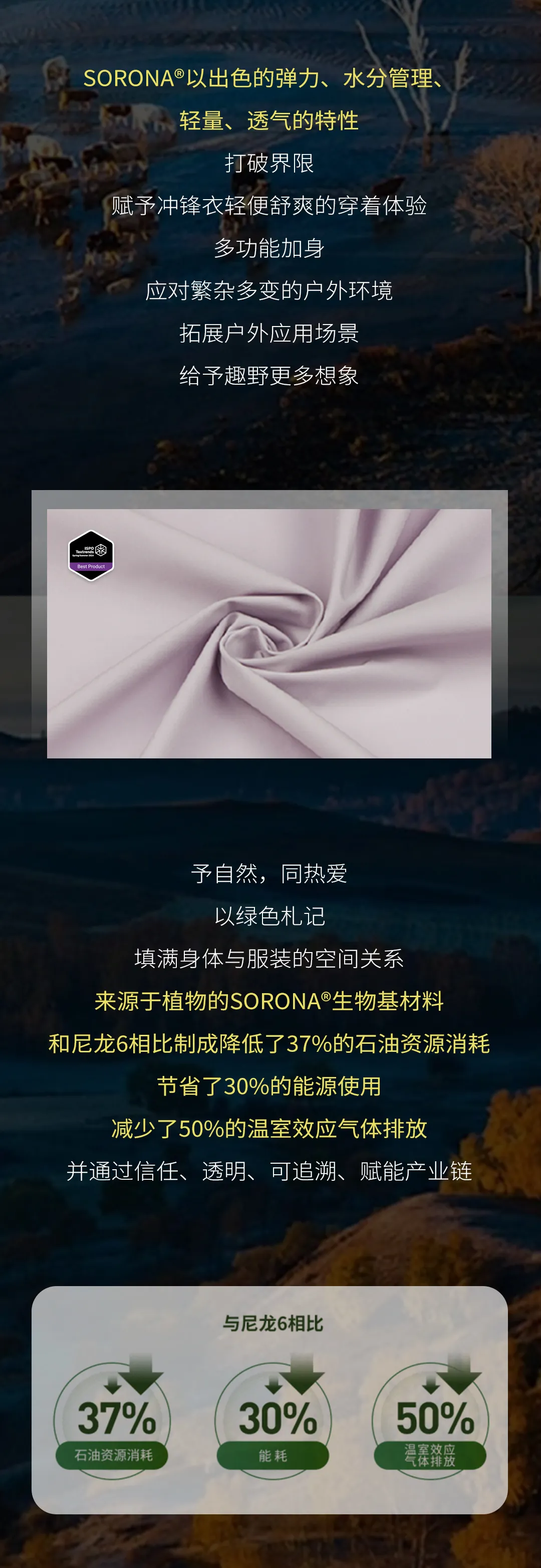 SORONA®是一项突破性的新型生物基聚合物解决方案,其核心原料来自每年可重复生长的植物。SORONA®不仅具有符合潮流趋势的可持续发展和环保主题,而且可以为纤维带来多种功能的优良特性。用SORONA®原料制成的纤维的“多功能性”为面料和服装设计师提供了更大范围的设计自由!