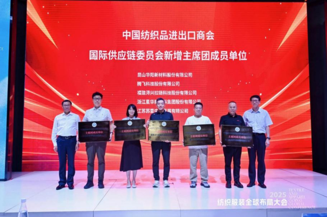 中国纺织品进出口商会国际供应链委员会自去年10月成立以来,开展了一系列参访考察、行业交流、商贸对接等活动,获得行业的高度认可,吸引了越来越多的纺织服装产业链上下游优秀企业加入到这个”大家庭“。在本次大会上,中国纺织品进出口商会曹甲昌会长、张锡安副会长共同为昆山华阳新材料股份有限公司、福建浔兴拉链科技股份有限公司、腾飞科技股份有限公司、江苏苏豪中锦发展有限公司、浙江星华反光新材料集团股份有限公司等五家新增主席团成员企业授牌。