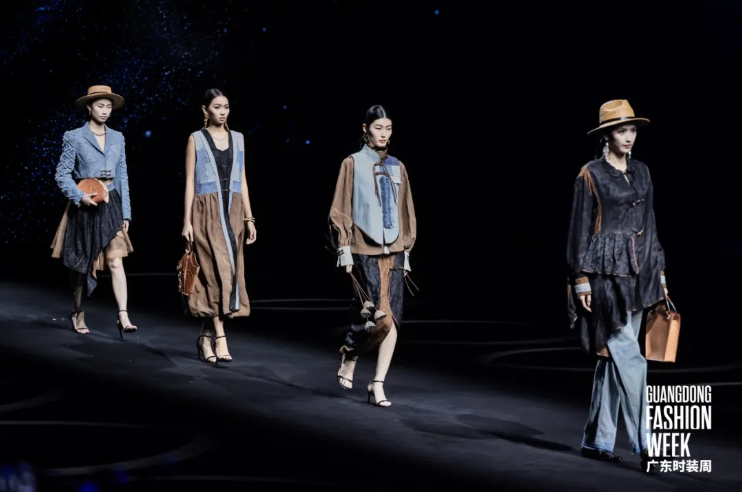 本次发布的15套作品深度融合广东本土国家级非物质文化遗产——香云纱染整技艺与广绣盘金绣工艺,并创新性地将传统材质与牛仔面料进行跨界结合。香云纱的柔美光泽与牛仔的粗犷质感形成强烈对比,盘金绣的华美纹样跃然于日常服饰之上,既保留传统技艺的精髓,又赋予其年轻的时尚气息。
