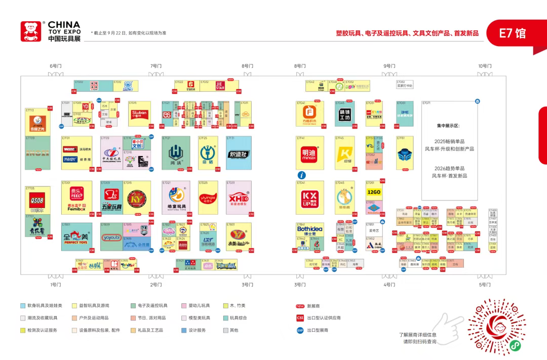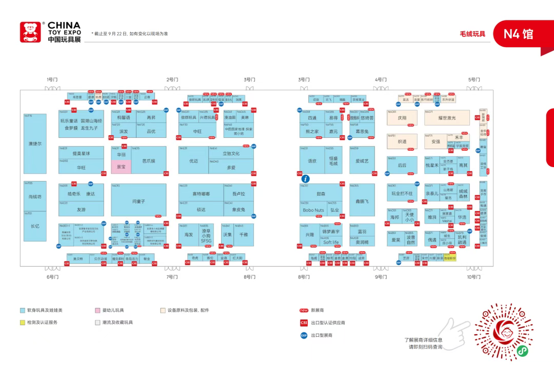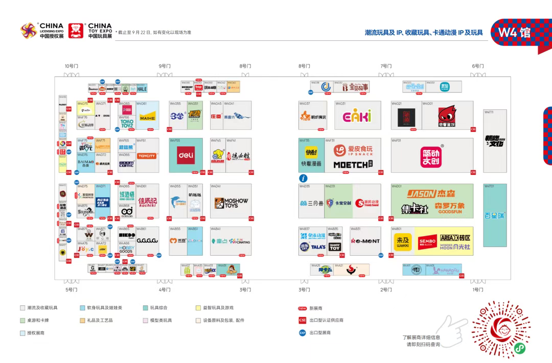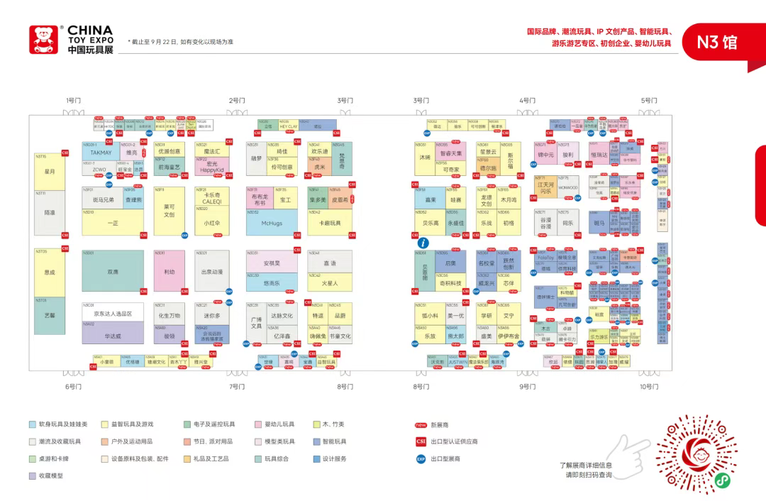 作为国家级行业协会主办,国内外展商和买家首选,全球领先的玩具潮玩、婴童用品、授权、幼教专业化和国际化商贸平台,中国玩协四展吸引了全球41个国家和地区以及30大玩具、婴童用品主产区2629位展商携5426个品牌、2600+全球正版IP参展,展览面积覆盖上海新国际博览中心全部展馆达23万平方米,齐聚国内外10万+专业观众。接下来,让我们提前了解下具体展馆分布和展商点位情况,实现高效逛展!
