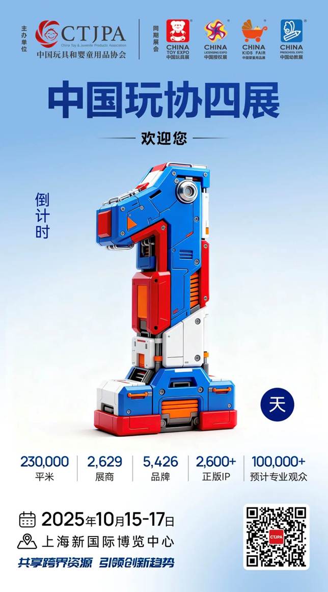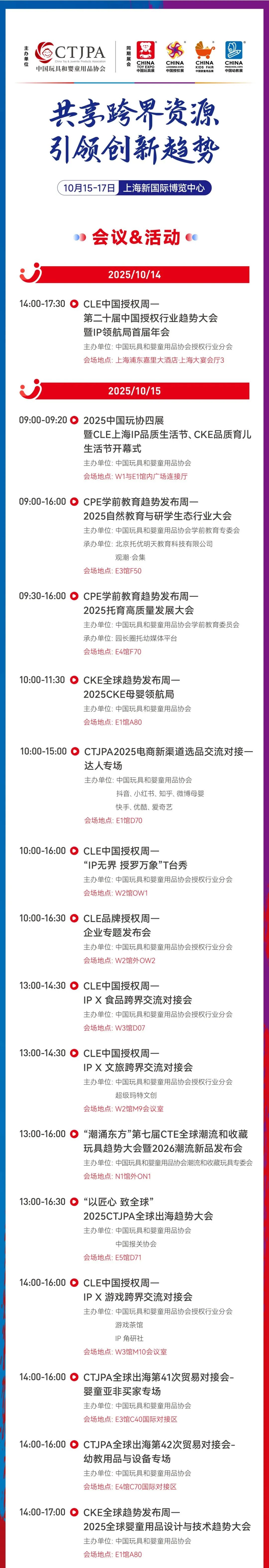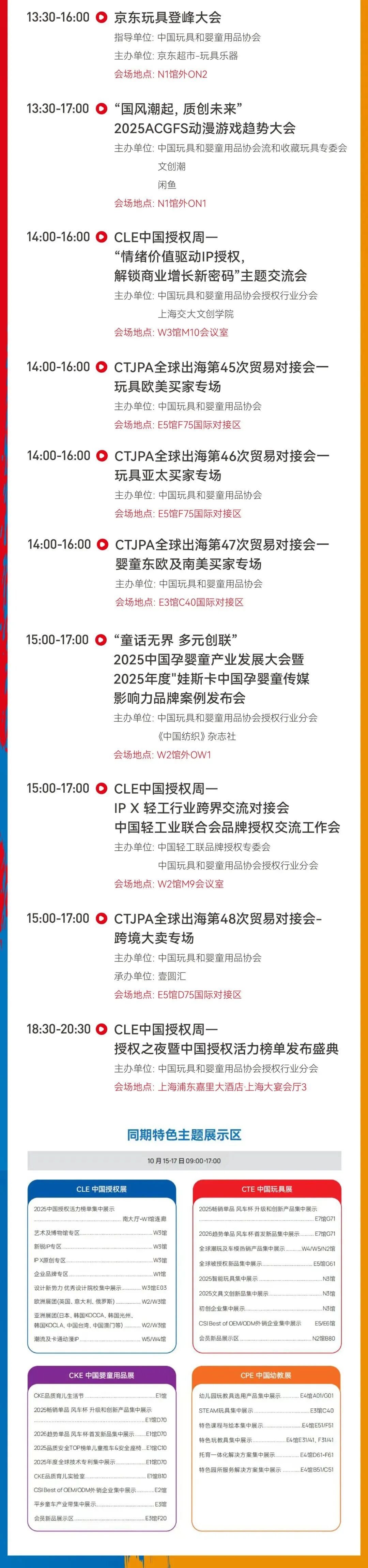 2025 年 10 月 15 日-17 日,CLE 中国授权展将在上海新国际博览中心举办。本届展会展览面积超 65000 平米,吸引国内外 566 个展商, 超 2600 个全品类 IP 参展。CTE中国玩具展&潮玩展、CKE中国婴童用品展、CPE中国幼教展也将在上海新国际博览中心举办。