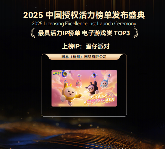 在 10 月 16 日举办的第 10 届 CLE 授权之夜暨中国授权活力榜单发布盛典上,《蛋仔派对》凭借高频授权次数、火爆社媒数据和在年轻人群中的广大 IP 影响力荣登最具活力 IP 榜单电子游戏类 TOP 3。
