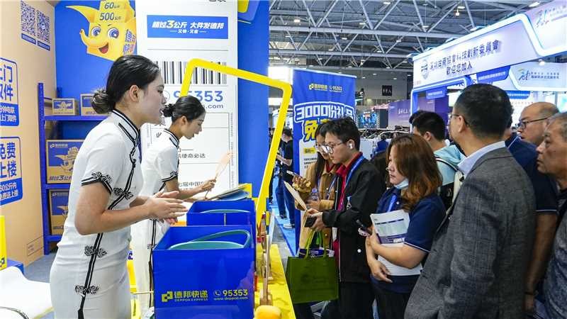 在10号馆的主通道上,10—B75展位前人流如织。50平方米的空间里,德邦快递搭建了一个兼具展示、体验与互动的“迷你物流场景”。扫码可领展会限定礼品,发小红书领漆扇活动人气爆棚,视频号直播区则持续传来掌声与讨论声——每天两场、每场两小时,带线上线下观众一起“逛展”“看服务”“聊方案”。