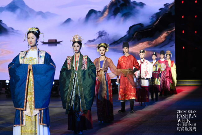 大秀以“过去-现在-未来”的时空轴为主线,演绎中国时尚产业的传承与变革,具象化展现中山服装产业的发展脉络。在“汉唐—霓裳塑梦”篇章,模特身着唐装汉服,在红博城的亭台楼阁间穿梭,演绎诗仙李白一生仕途起伏的故事,灯光与烟花秀的加持让传统服饰的典雅之美展现得淋漓尽致。这一篇章不仅是对非遗文化的致敬,更体现了中山服装企业对传统元素的挖掘与创新应用,为产业发展注入文化底气。