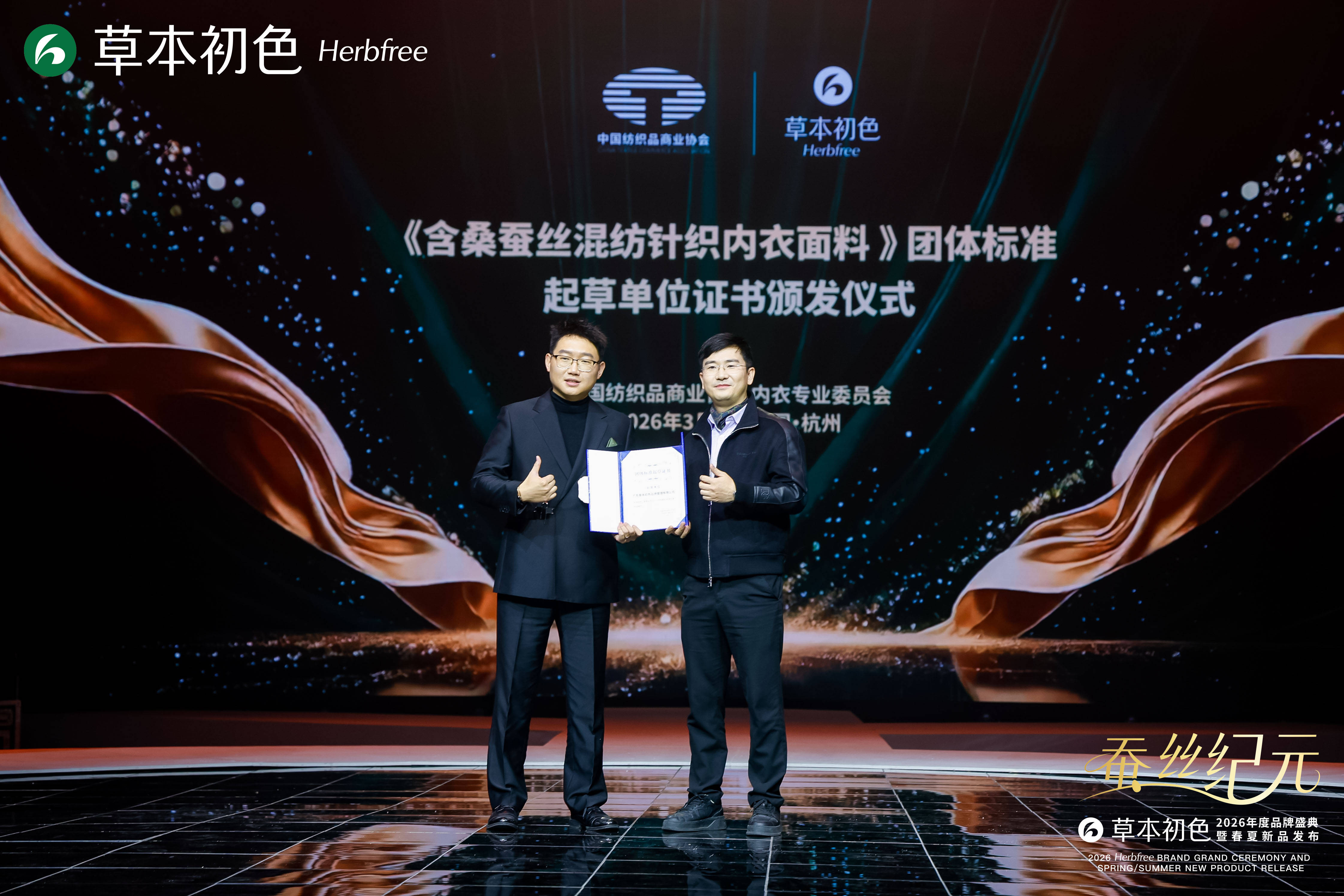 2026年3月5日,在杭州艺尚小镇国际秀场举办的“蚕丝纪元 - 草本初色2026年度品牌盛典暨春夏新品发布会” 上,两大重磅权威认证落地,成为中国桑蚕丝内衣行业发展的重要里程碑。 中国纺织品商业协会发布,由草本初色等4家行业单位共同起草的《含桑蚕丝混纺针织内衣面料》团体标准;同时完成新华社《中国名牌》内衣品类唯一品牌伙伴揭牌仪式,凭借硬核技术实力与卓越产品品质,从行业“参与者”跃升为“标准制定者”,以双重权威背书引领行业迈入规范化、高品质发展新阶段。