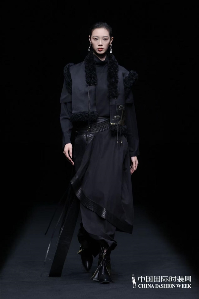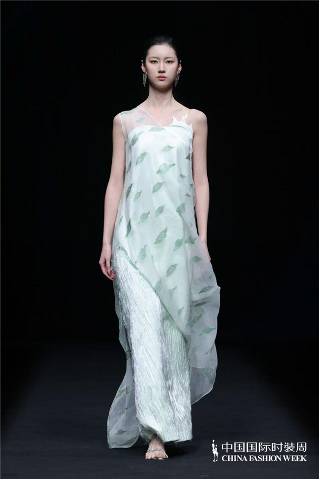 “天人合一”的理念贯穿系列设计始终,设计师贺荣摒弃传统纹样的原始堆砌,以留白式疏朗构图与满铺式肌理层次营造丰富视觉层次,将传统元素化作局部应用的巧思与细节装饰的精妙,在服装设计的“皮肤装饰”处做足文章,让东方意境融于现代审美。色彩上以自然色调为基底,从浅绿、浅蓝、米咖的清新雅致缓缓过渡至咖黑的沉稳大气,经典黑白、蓝绿及紫色系交织其间,如自然万象的光影流转,让穿着者在感受自然之美的同时,体悟人生的豁达与从容,实现视觉与心灵的双重滋养。