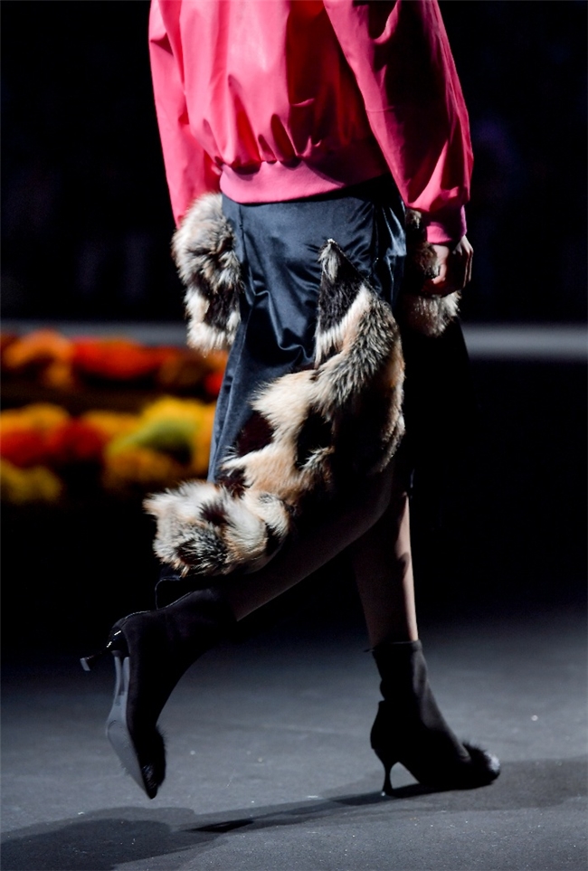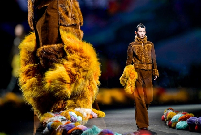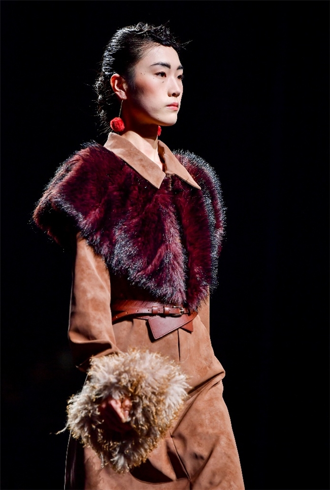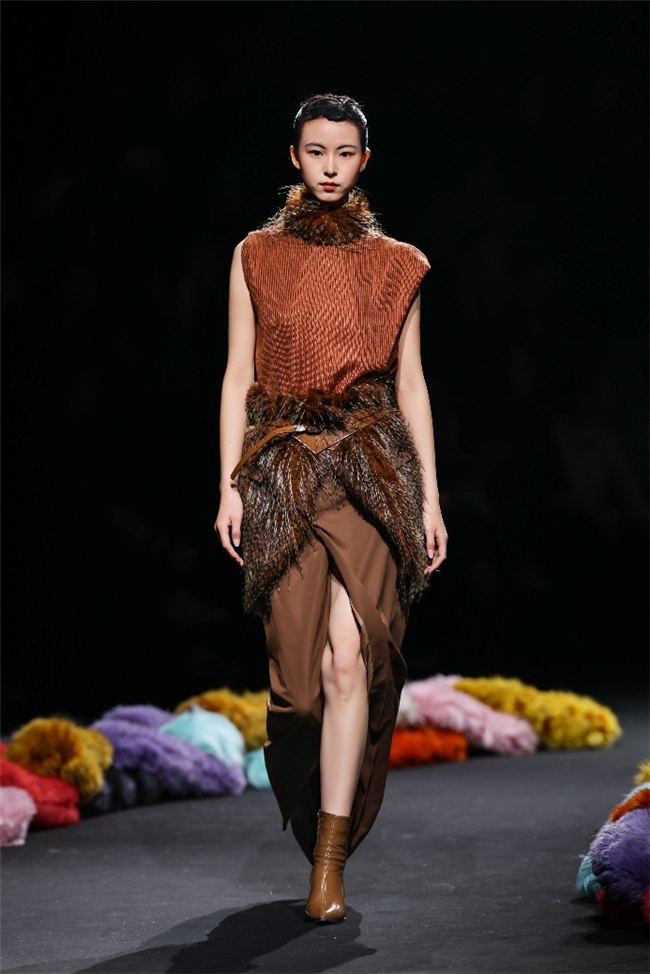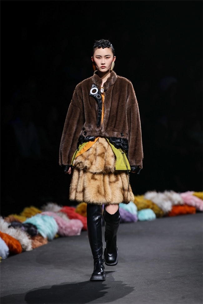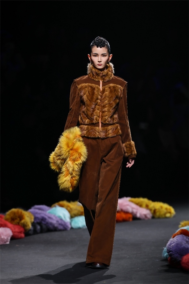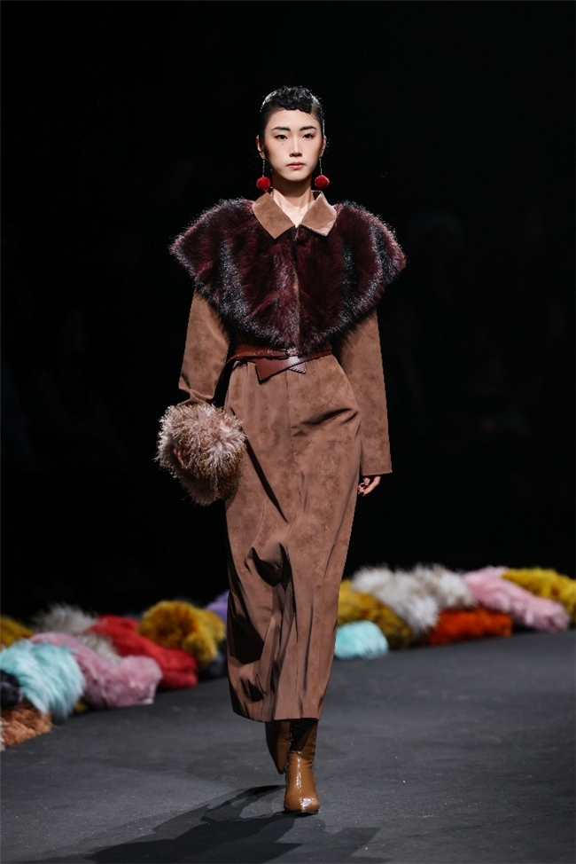 在“藏蕴”主题中,皮草设计回归复古新生、自然匠心等多重语境,打造出兼备自然主义与都市功能的系列单品。设计以香料红棕、霜草绿等“长期主义”的中性色为主调,在古韵匠心与文化包容的氛围里,传递出岁月温度与实用价值。纬一精选质感温暖奢雅的密实毛绒材质,搭配宽大松弛的廓形,完美演绎浪漫粗犷的乡野户外风格,并在长、短毛绒的组合中,为简约实穿单品强化轻机能风。而岩石地貌、生动苔藓和做旧压褶等肌理外观,则在多元化的应用场景中,铺陈出强烈的生态美学。