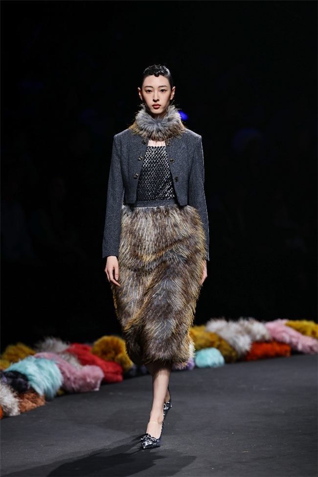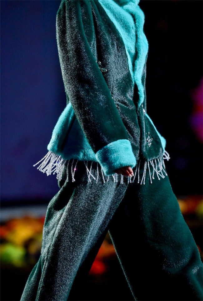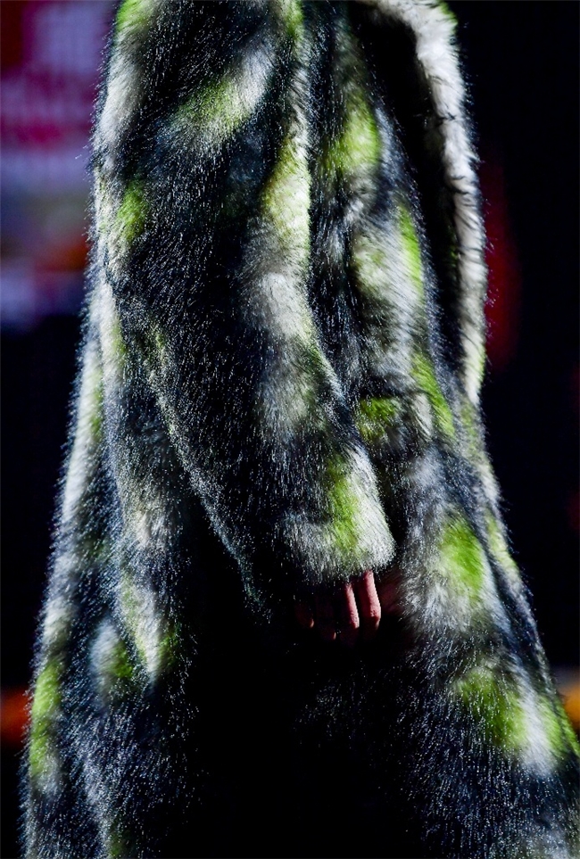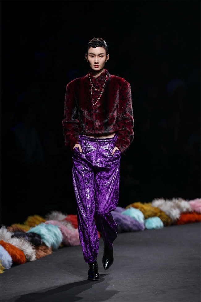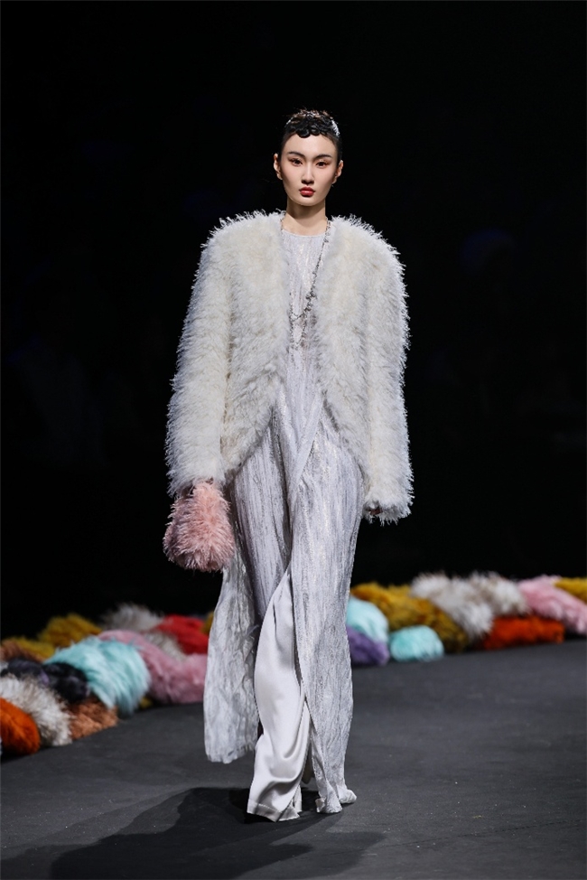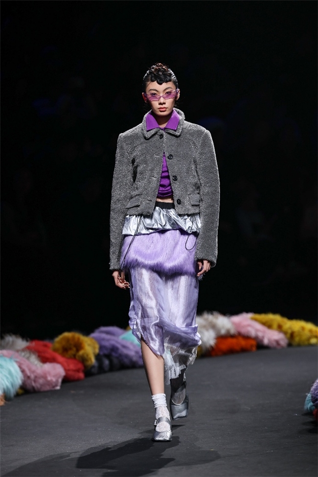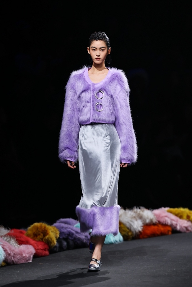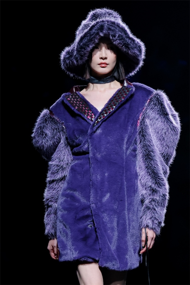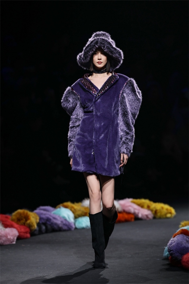 实验性的视觉语言,成为“光影”主题探索奇幻艺术与数字未来的关键。纬一以前沿工艺打造的高品质毛绒面料,通过鲜明质感的对撞,结合银莲紫、青草绿、青天蓝等酸性色调的大胆浸润,构建出如迷离霓虹般的美学场域。而织物表面的立体肌理、抽象图案、夸张兽纹,在简洁有力的廓形托举下,于虚实交错间展露强烈的视觉张力,演绎观感前卫的奢华风尚。一系列质地柔顺的皮草面料以或暗哑或华美的光泽,碰撞不对称解构廓形及层搭设计,有效回应年轻一代对个性表达与日常实穿的双重诉求。