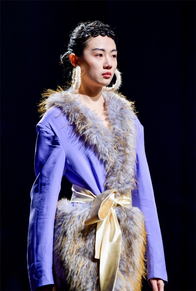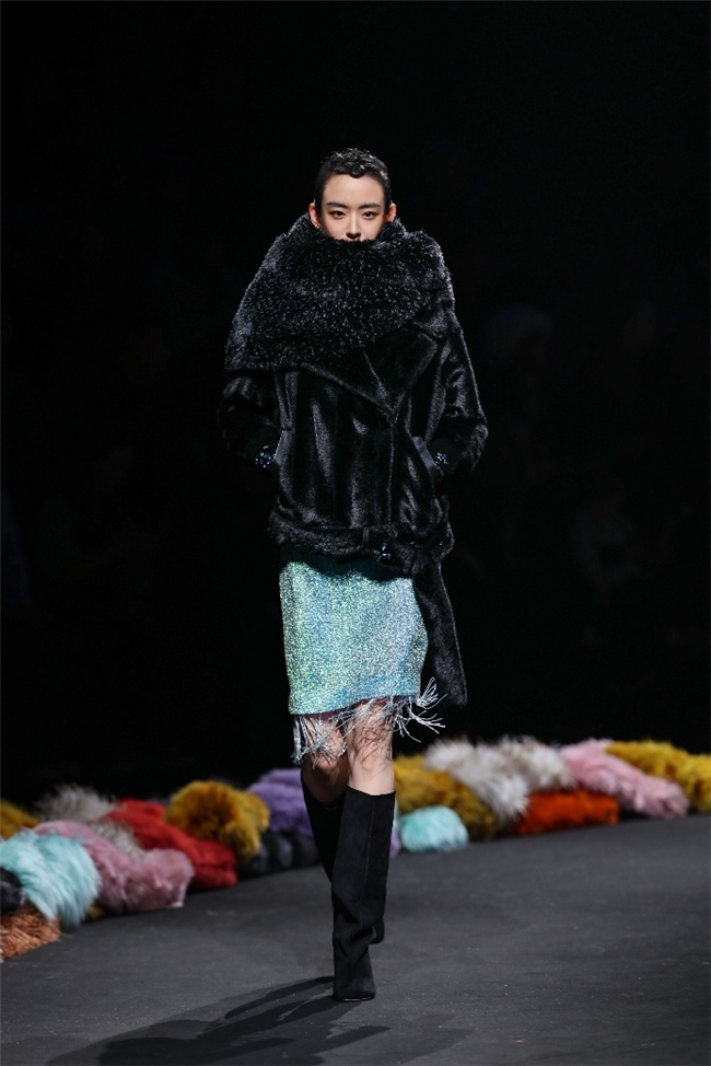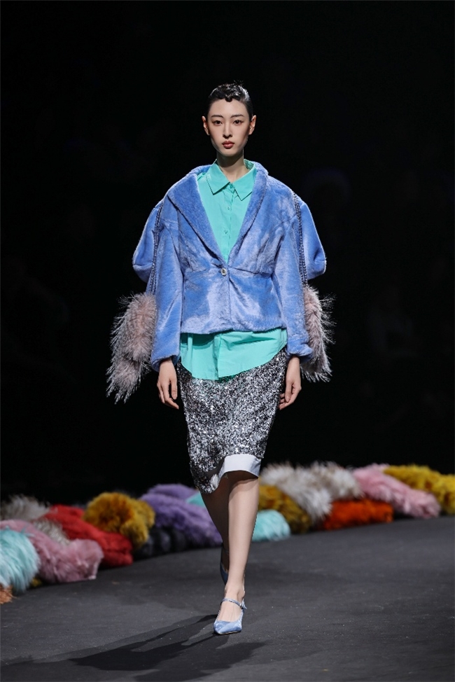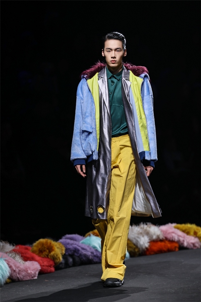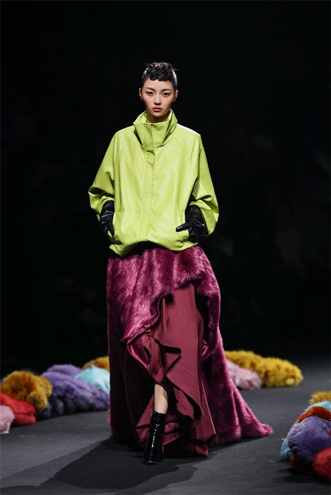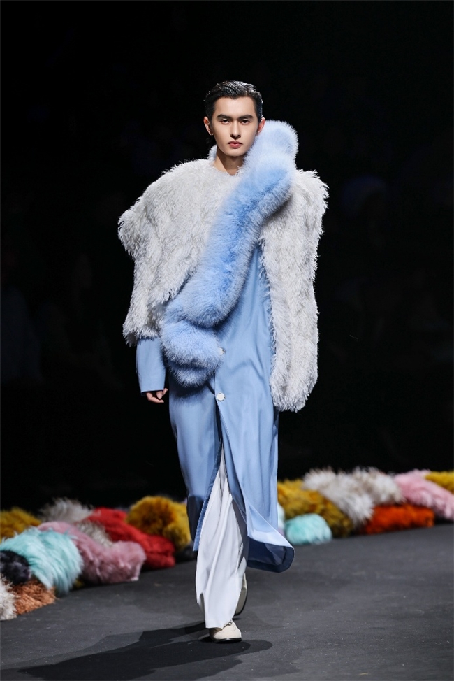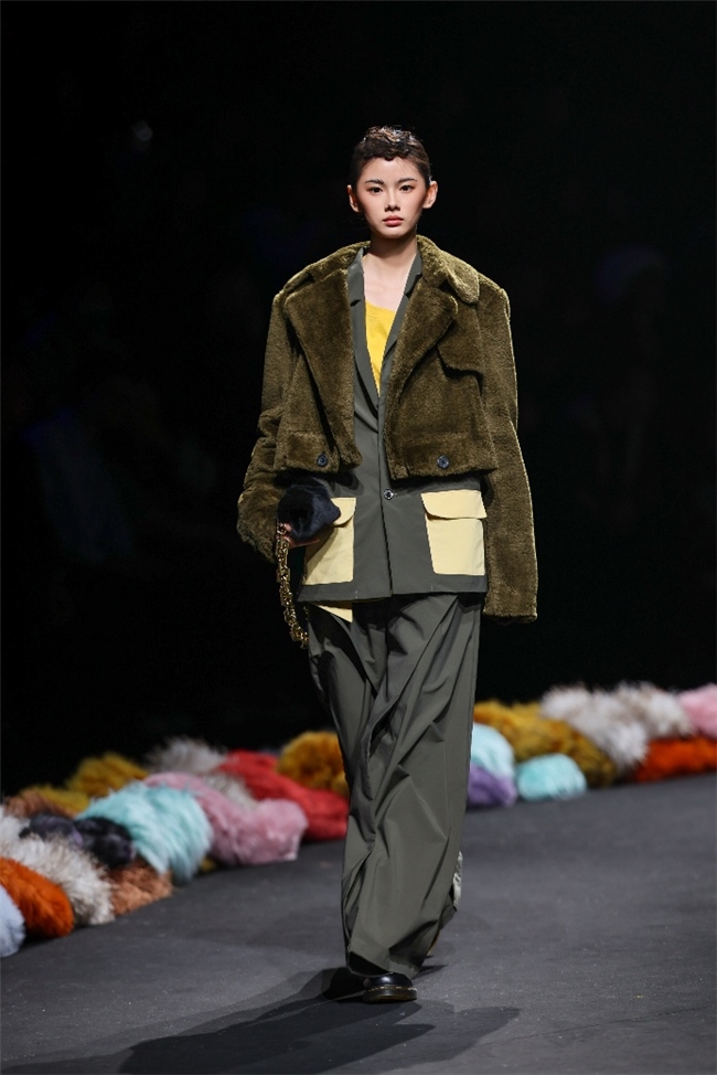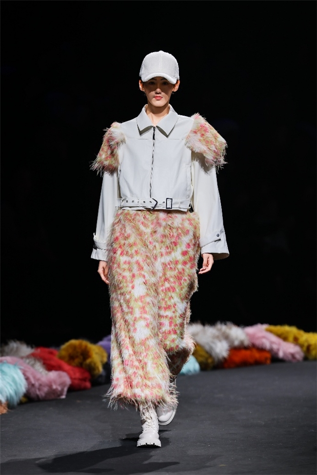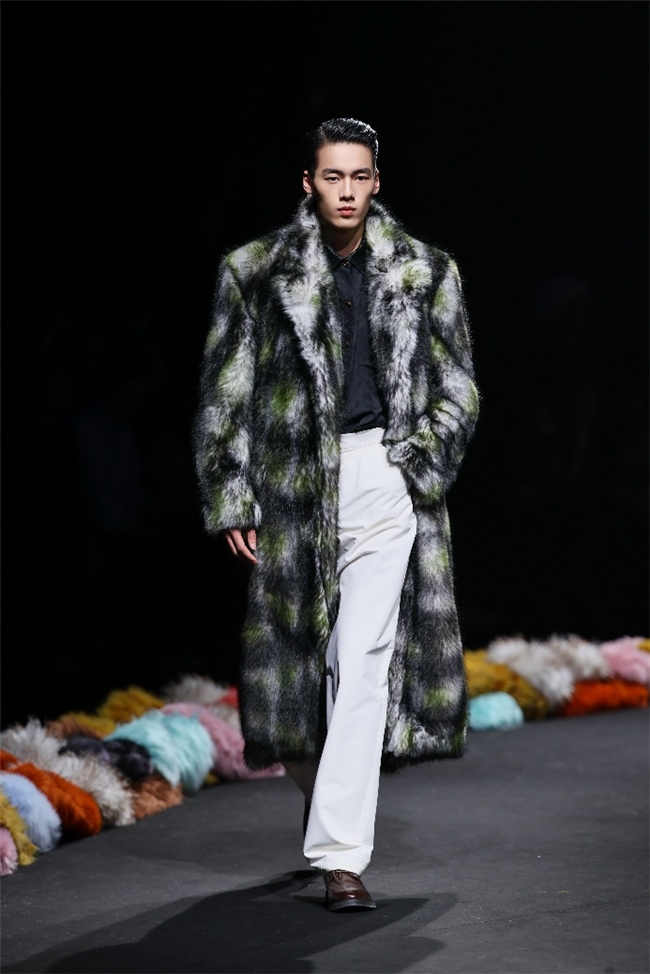 实验性的视觉语言,成为“光影”主题探索奇幻艺术与数字未来的关键。纬一以前沿工艺打造的高品质毛绒面料,通过鲜明质感的对撞,结合银莲紫、青草绿、青天蓝等酸性色调的大胆浸润,构建出如迷离霓虹般的美学场域。而织物表面的立体肌理、抽象图案、夸张兽纹,在简洁有力的廓形托举下,于虚实交错间展露强烈的视觉张力,演绎观感前卫的奢华风尚。一系列质地柔顺的皮草面料以或暗哑或华美的光泽,碰撞不对称解构廓形及层搭设计,有效回应年轻一代对个性表达与日常实穿的双重诉求。