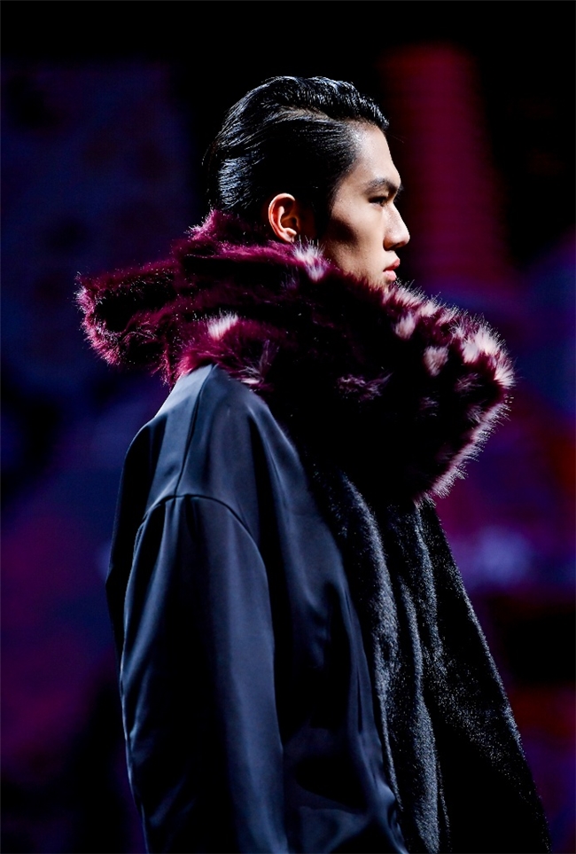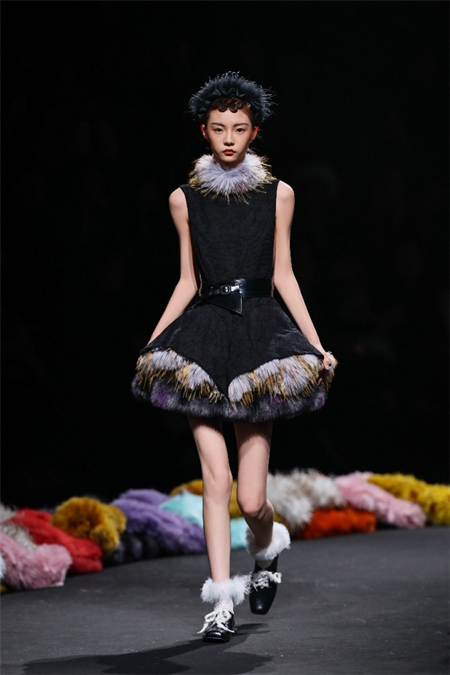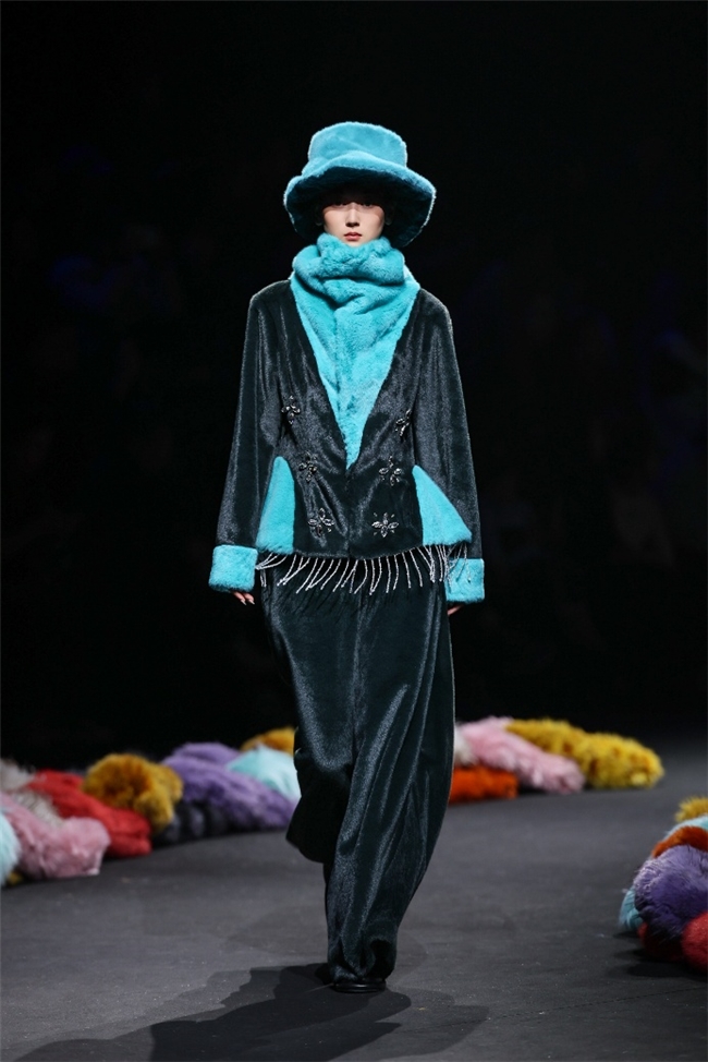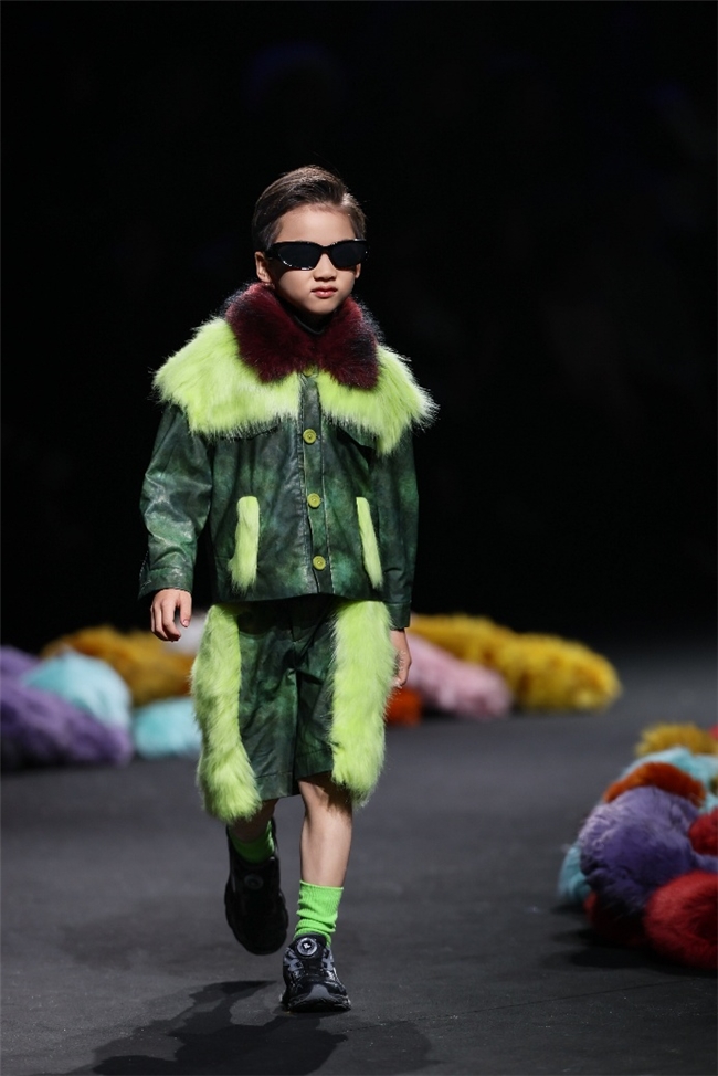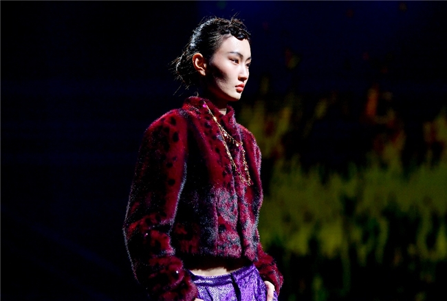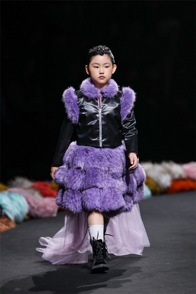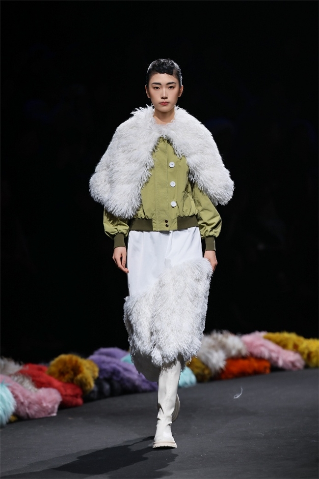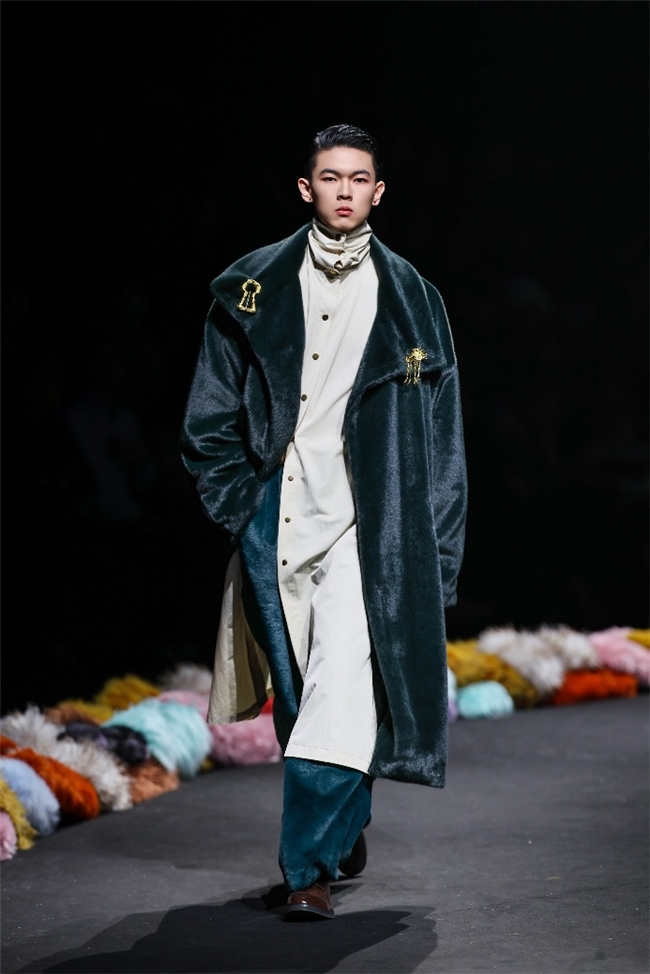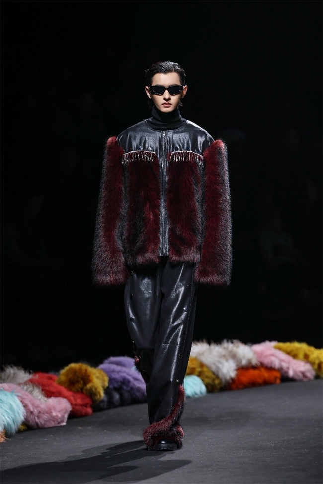 实验性的视觉语言,成为“光影”主题探索奇幻艺术与数字未来的关键。纬一以前沿工艺打造的高品质毛绒面料,通过鲜明质感的对撞,结合银莲紫、青草绿、青天蓝等酸性色调的大胆浸润,构建出如迷离霓虹般的美学场域。而织物表面的立体肌理、抽象图案、夸张兽纹,在简洁有力的廓形托举下,于虚实交错间展露强烈的视觉张力,演绎观感前卫的奢华风尚。一系列质地柔顺的皮草面料以或暗哑或华美的光泽,碰撞不对称解构廓形及层搭设计,有效回应年轻一代对个性表达与日常实穿的双重诉求。