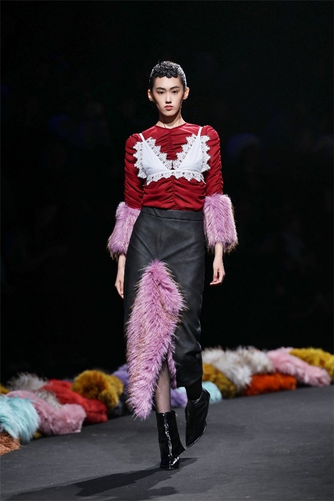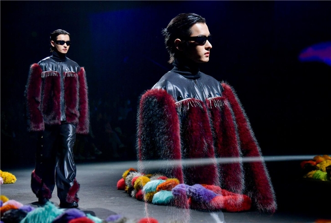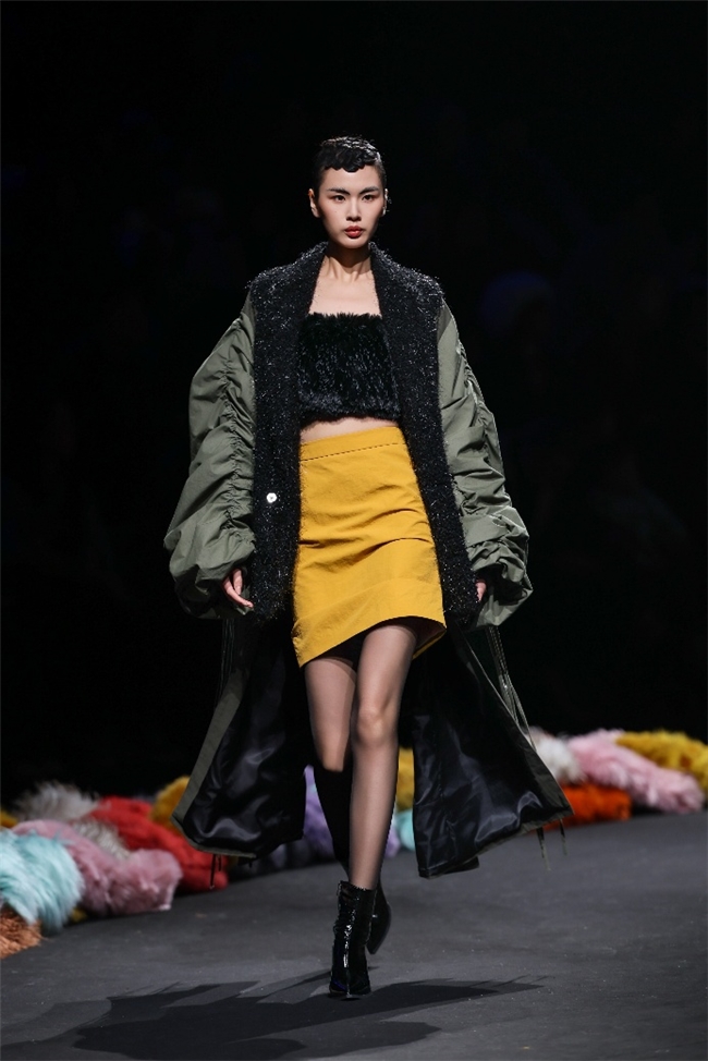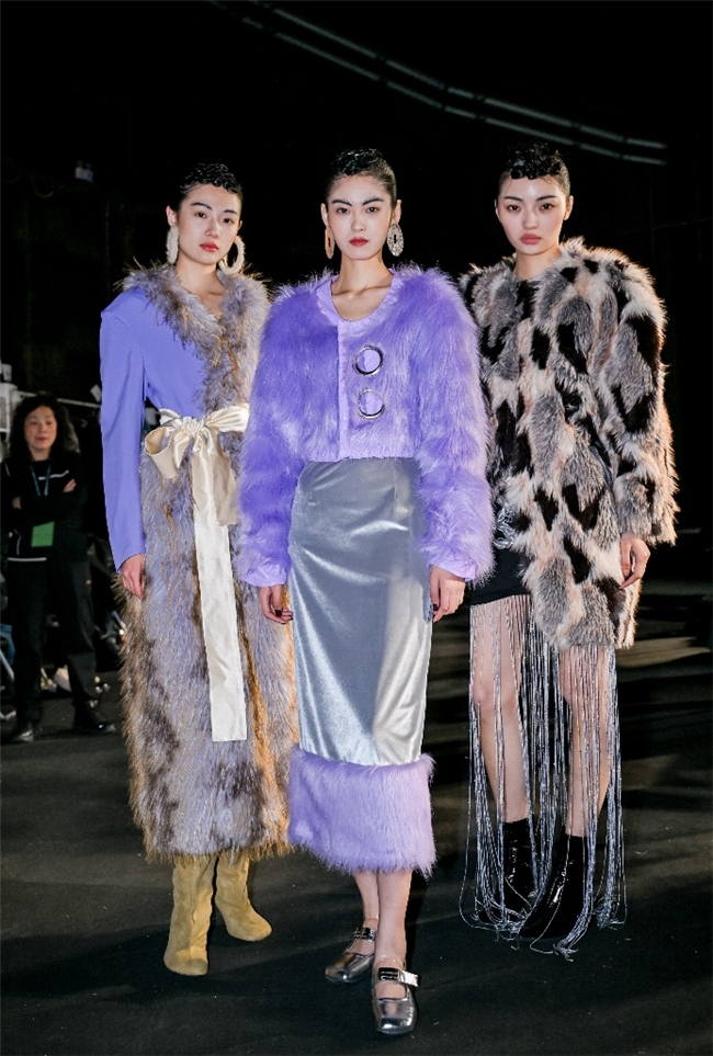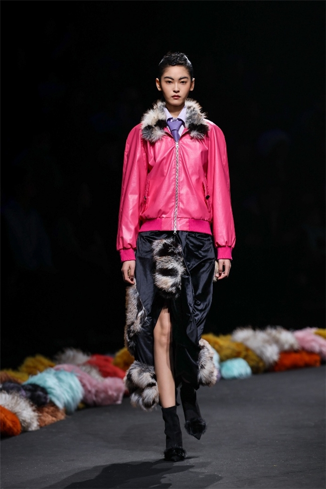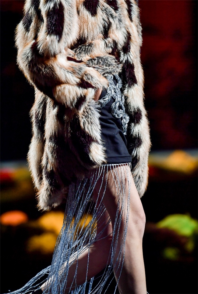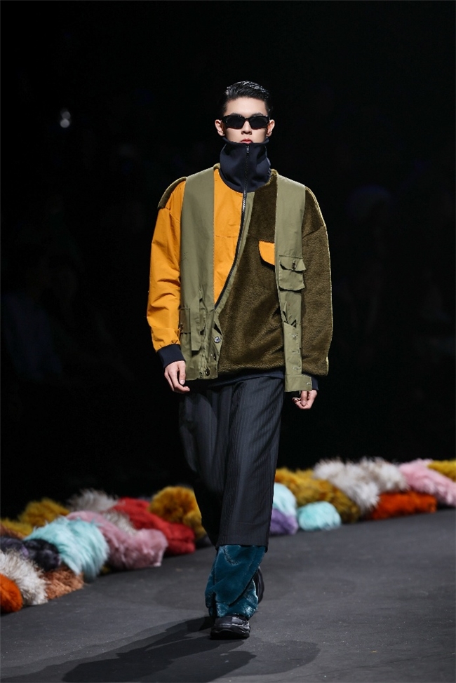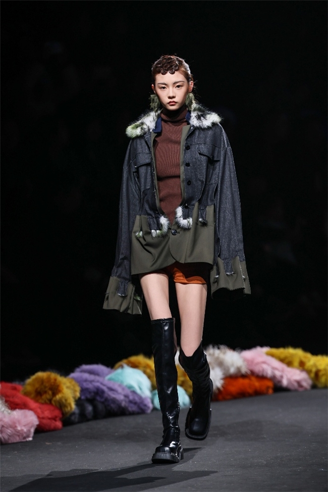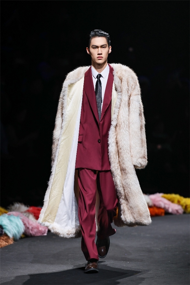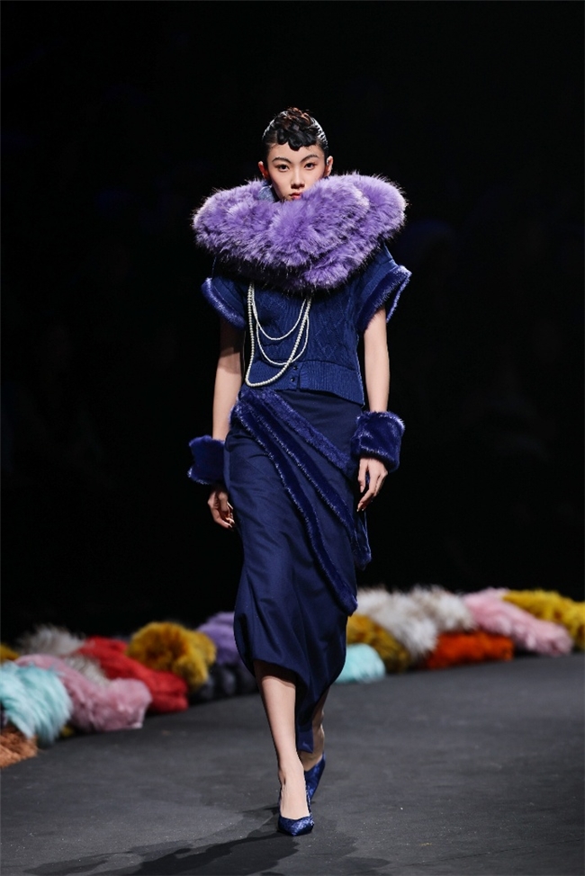 实验性的视觉语言,成为“光影”主题探索奇幻艺术与数字未来的关键。纬一以前沿工艺打造的高品质毛绒面料,通过鲜明质感的对撞,结合银莲紫、青草绿、青天蓝等酸性色调的大胆浸润,构建出如迷离霓虹般的美学场域。而织物表面的立体肌理、抽象图案、夸张兽纹,在简洁有力的廓形托举下,于虚实交错间展露强烈的视觉张力,演绎观感前卫的奢华风尚。一系列质地柔顺的皮草面料以或暗哑或华美的光泽,碰撞不对称解构廓形及层搭设计,有效回应年轻一代对个性表达与日常实穿的双重诉求。