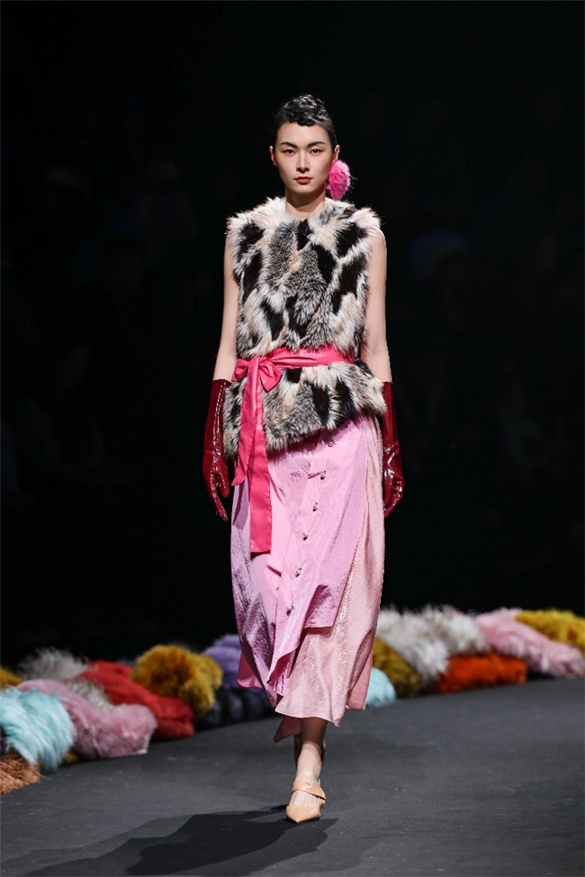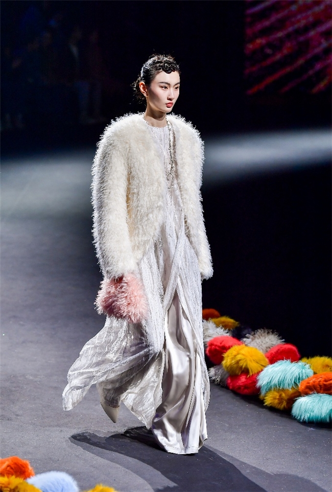 “流淌”主题凭借松弛灵动的轻暖单品,在柔雾粉蜡色与都市感亮彩的共同渲染下,映衬出治愈慵懒的现代冬日氛围。为了造就舒适浪漫的感官体验,纬一甄选一系列柔软顺滑、质地轻盈的皮草面料,以A型、茧型等宽松、流畅的优雅廓形为舞台,借由充满暖意的蓬松外观,实现对身体如云朵般的轻柔包裹,让自然随身的柔美服装,在含蓄的跃动和无限的包容中,演绎充满精致格调的绒感魅力。垂感良好的织物更以丰富的肌理和靓丽的提花效果升维视觉体验,为日常生活增添更多盎然鲜活的设计意趣。