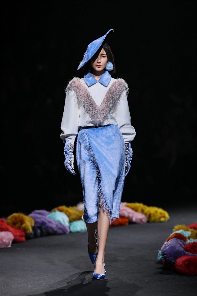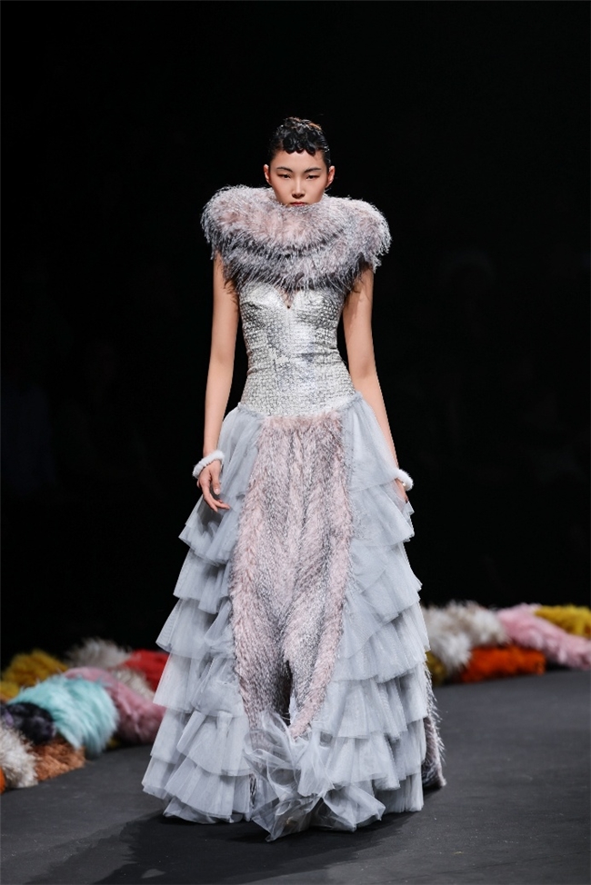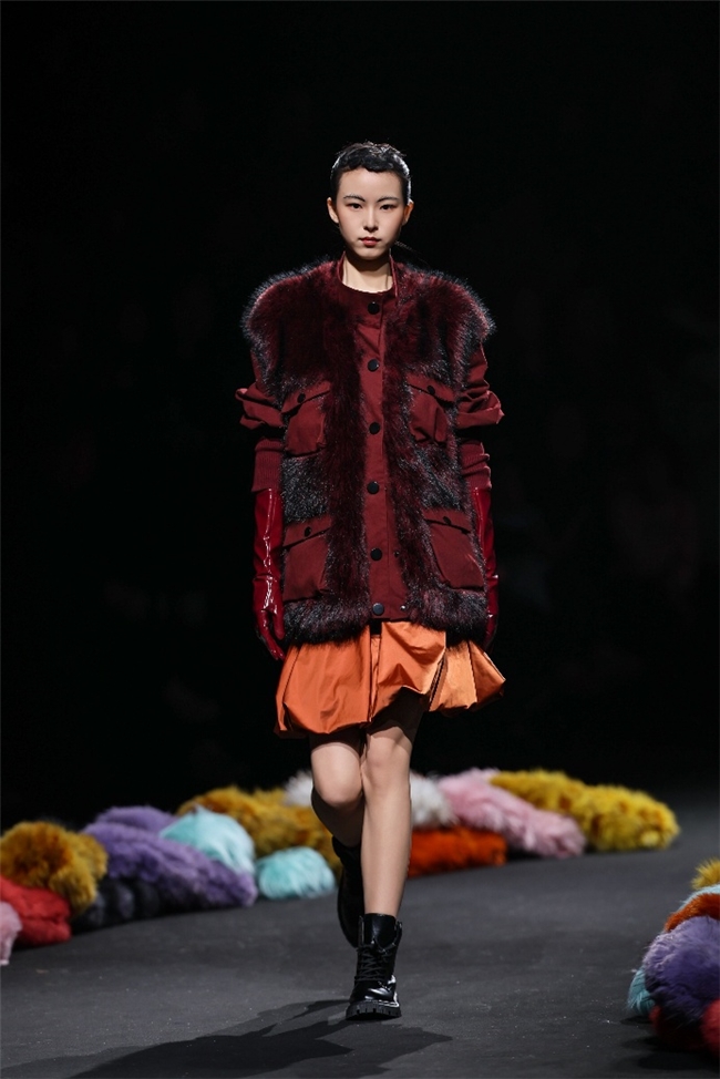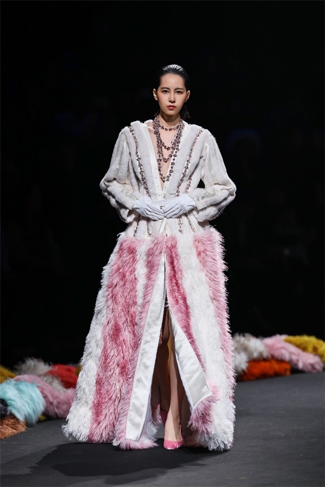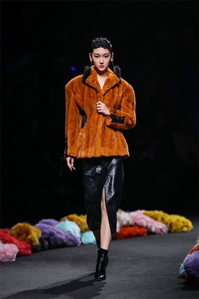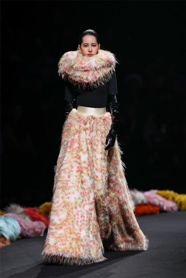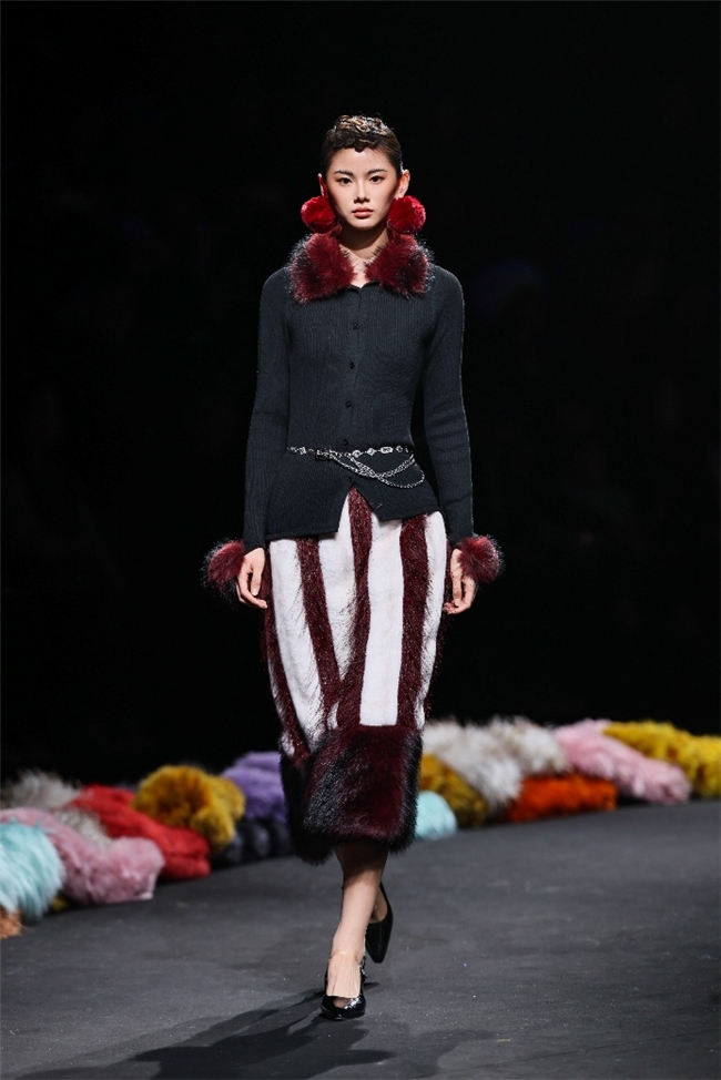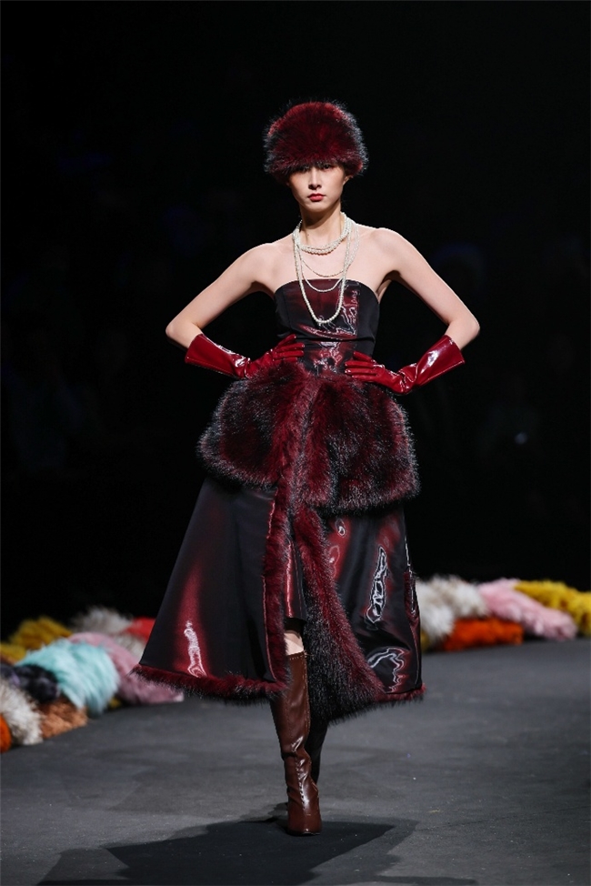 “雕琢”主题以一众实用奢华的皮草单品,诠释品质设计的永恒魅力和肃穆典雅的新古典美学。质地丰盈的毛绒织物以经典的裙装、大衣廓形为载体,通过流畅剪裁呈现出柔韧、舒展的线条,在庄重和松弛的平衡中,赋予实穿款型日夜皆宜的特色。特别值得一提的是,纬一凭借卓越的研发实力,重塑织物纤维结构和织造工艺,让仿水貂等面料还原真实的天然皮草光泽,更在鸡血石红、翠石绿等浓郁色调的交织中,结合材质拼接和微妙天然的肌理表现,让每一件单品都显露温润华美的高端质感。