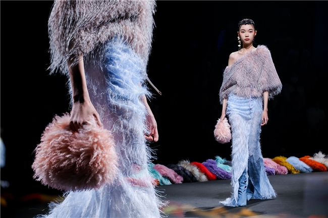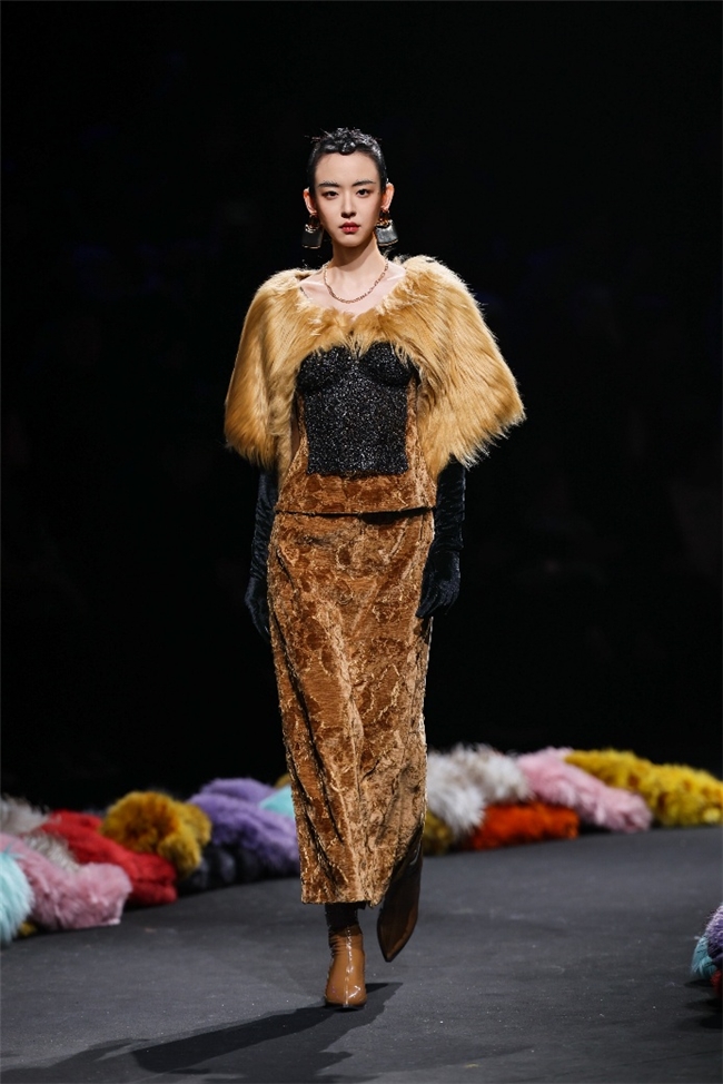 作为“AW26流行趋势发布秀”的华彩章节——本场发布秀由纬一多次合作的新锐设计精英张玮倾力打造。秀演以本季流行趋势的核心概念“聚势”为主旨灵感,将前沿趋势与设计巧思同纬一仿水貂、提花等优质面料深度碰撞,借由“雕琢、流淌、藏蕴、光影”四大主题篇章展开设计叙事。秀演在面料触感、光泽、质感的相融相生间,回归产品本质,于优雅、松弛的氛围中,探索可持续人造皮草流行趋势的发展趋向,让科技赋能的环保面料绽放别样时尚魅力。