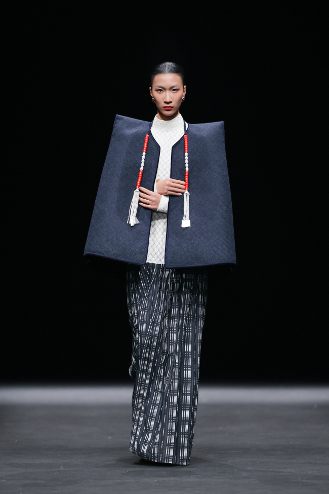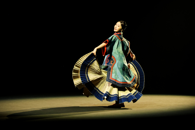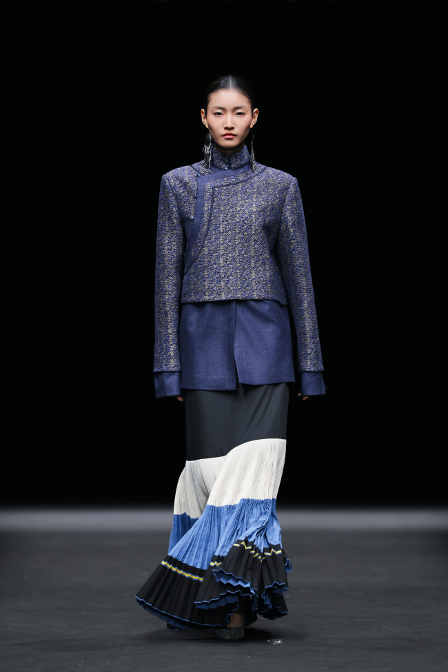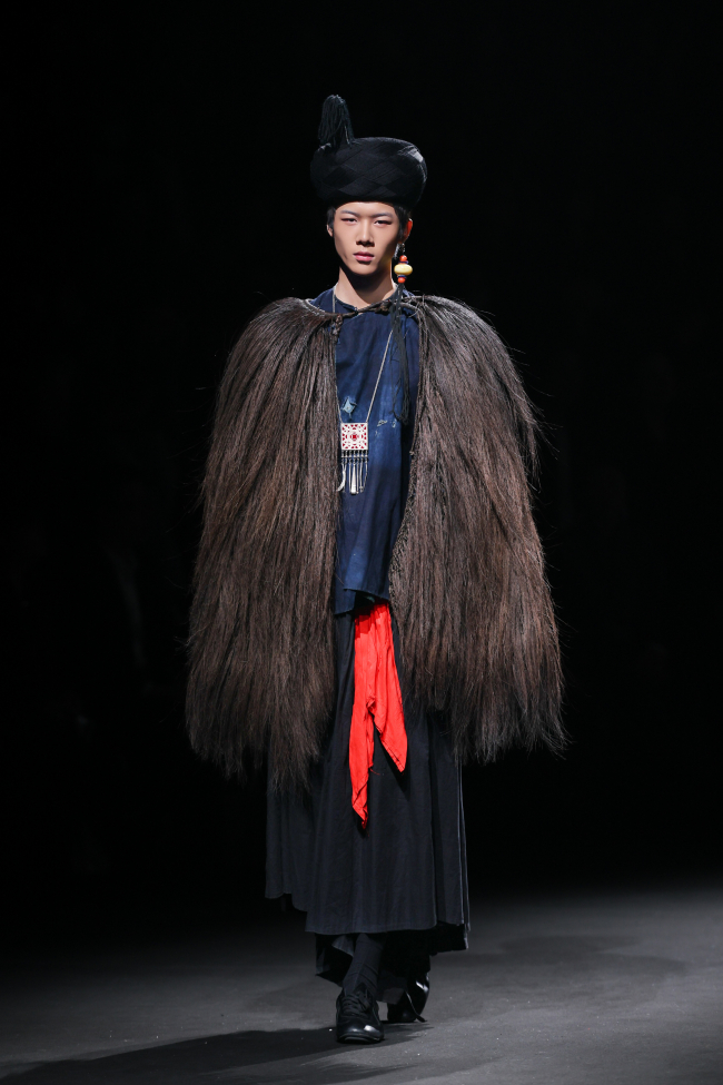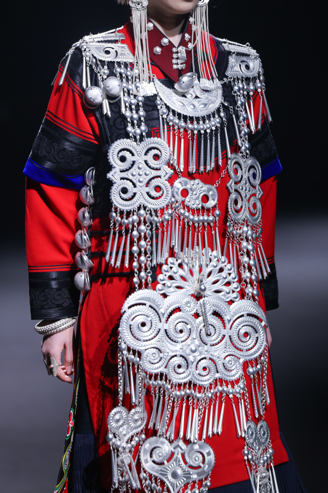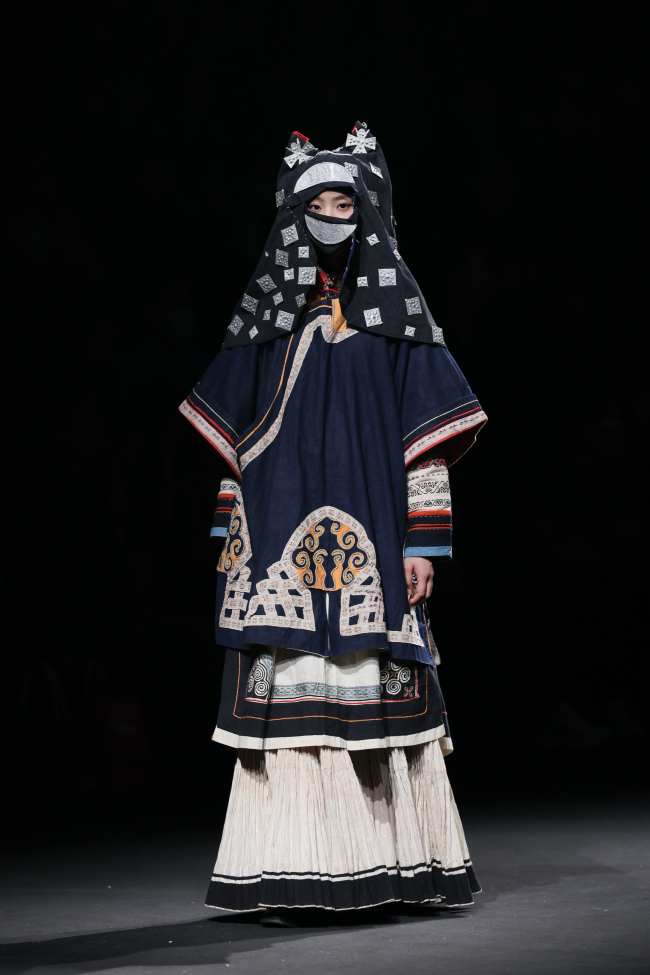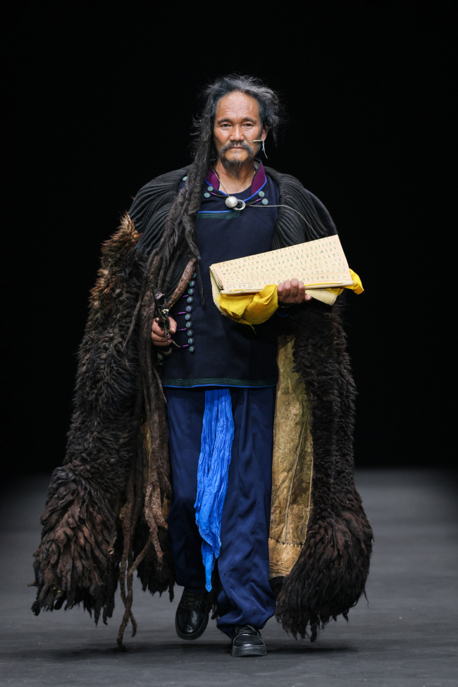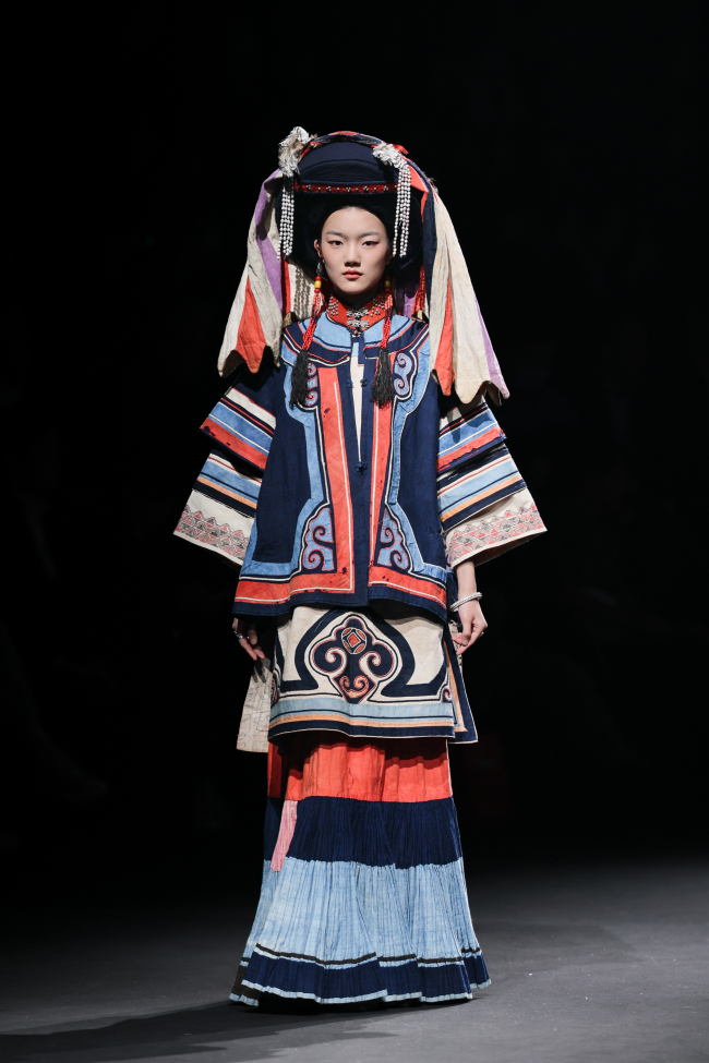 开篇“源启”极具震撼,随着“毕摩”非遗传承人以低沉雄厚的声音吟诵着对山河无恙、生活美好的祈愿,大秀缓缓拉开序幕。北京电影学院的17位舞者在女孩的百褶裙旋转飞扬,男孩的查尔瓦斗篷翻动跳跃中,再现了彝族人民劳作、节庆、嫁娶的生活场景;随后,国家级非遗传承人贾巴子则带领彝绣、银饰、音乐等国家级、州级非遗传承人和北京服装学院、北京电影学院的表演团队共同演绎了从上世纪初到当下的共约30套传统服装,复现了彝人于山河间的生活图景。
