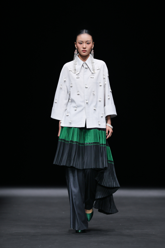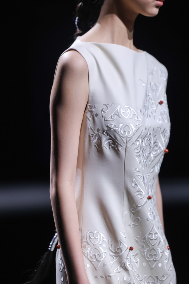 第三篇章“新生”则以近四十套大地色系的创新服饰,将传统纹样与现代面料交织成新的叙事语言——棕色承载泥土之厚重,米色示以稻麦的温润,灰色藏山石之沉静。马齿纹、火焰纹等被提炼为当代图形语言;粗精纺羊毛花呢、醋酸等面料碰撞激光切割、贴布绣、叠布绣、手工编织、压褶……,既溯源族群记忆,亦重塑当代时尚语境。在创新服装展示篇章,设计师还联合凉山州南红玛瑙品牌“小邓世家”共同打造的银饰与玛瑙首饰成为服饰搭配的亮点。本篇章的整体造型既呼应了古老的民族信仰,也是对彝族美学在当代语境中发出的既古老、又崭新的震撼回响。