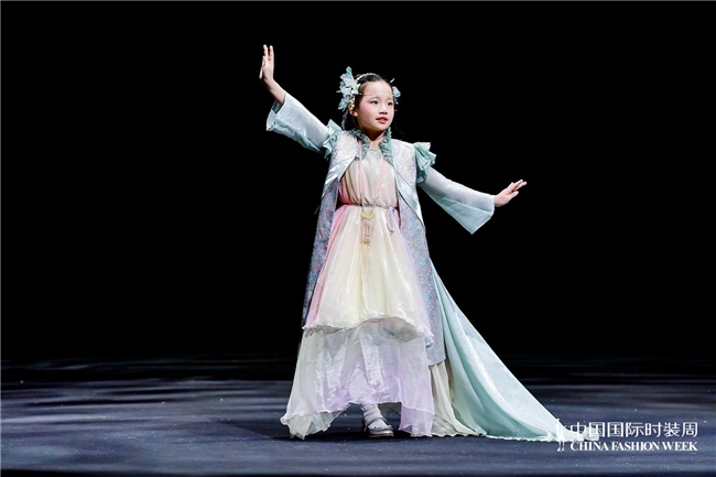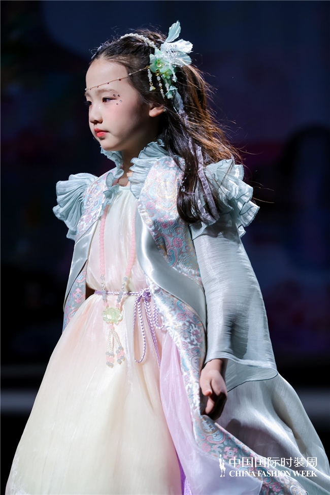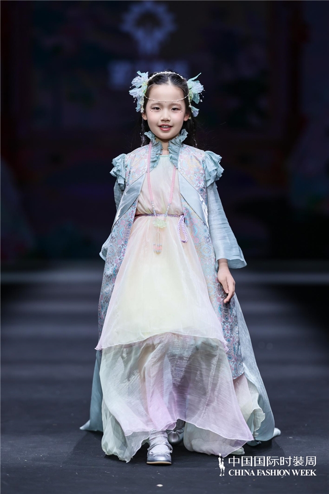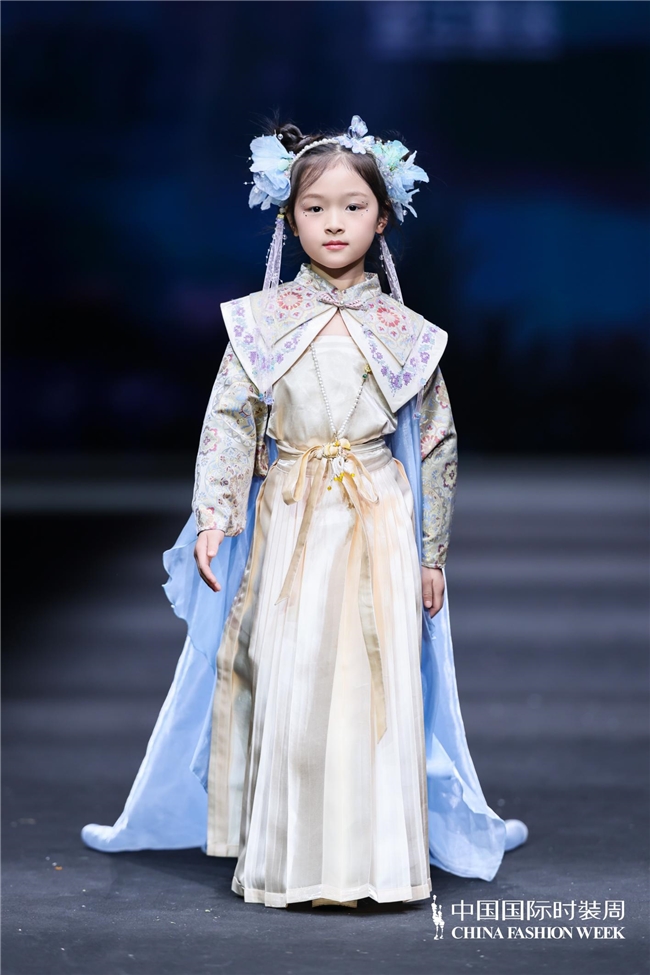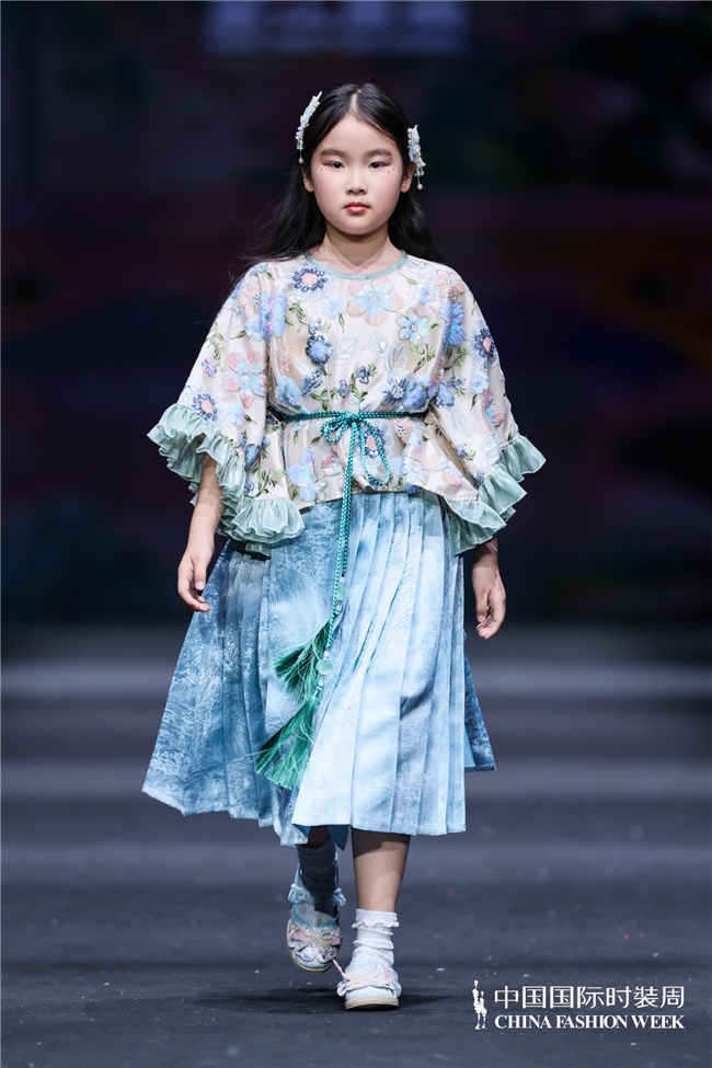 与“春野漫行”所呈现的自然与生活场景不同,“萌骥花马”主题系列将视角转向传统文化语汇在童装中的当代表达。设计师蒋卓君以非遗望江挑花为切入,将其与改良汉服元素相结合,并围绕马的趣味造型、由挑花演变而来的几何纹样以及自然花草元素展开设计,在保留文化意味的同时,也赋予整体更贴近儿童审美的亲和力与轻盈感。