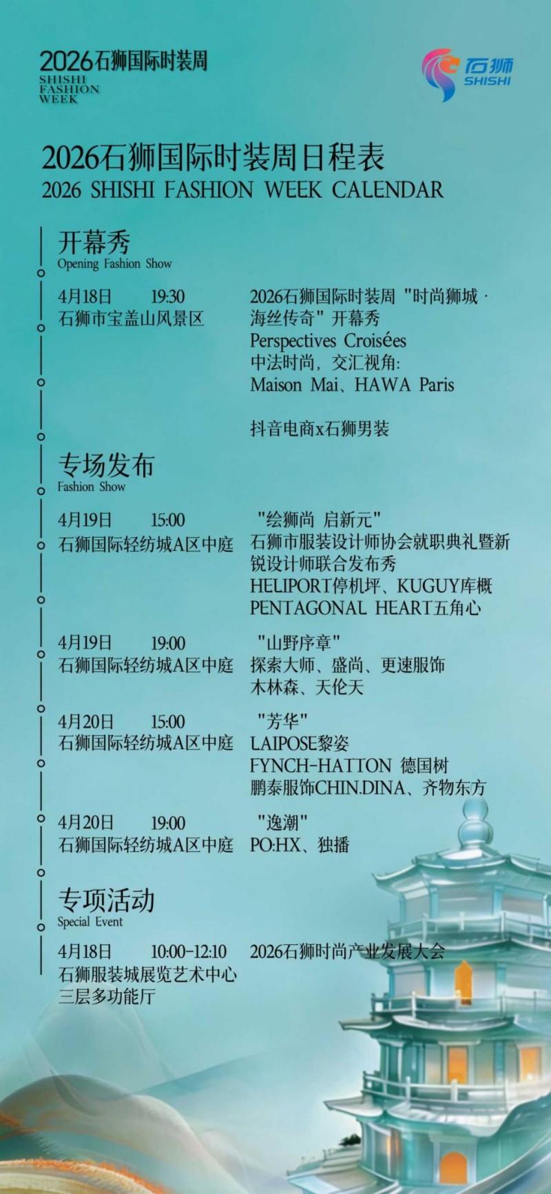 产业如山,撑起闽派脊梁;文化如潮,漫卷东方时尚。T 台上,以石狮非遗元素为灵感的设计将一次次掀起高潮。国家级非遗泉州刣狮的图腾被转化为提花面料上的暗纹,省级非遗蚶江海上泼水节的水波纹样化作流动的印花,六胜塔的轮廓被解构成肩线与腰封的立体结构……这些设计并非元素的生硬堆砌,而是与功能性面料、运动剪裁深度融合,让传统技艺焕发现代锋芒。同时,石狮正以“ 时尚+文旅”的组合拳,让流量变留量,让看秀的人变成逛城的人,让千年海丝活起来、潮起来。