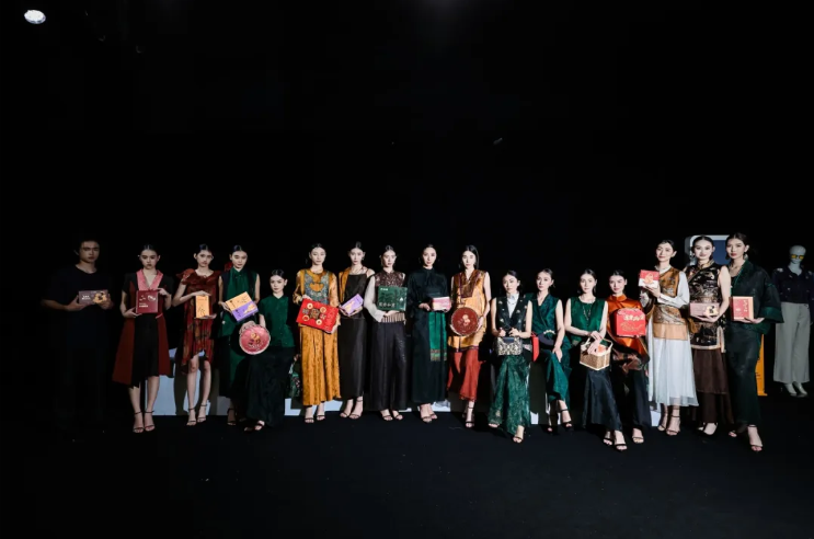 作为重磅发布,中国服装设计最高荣誉金顶奖获得者李小燕联手唐贤香云纱,以岭南百年老品牌莲香楼、惠如楼为文化根脉,以非遗香云纱为材质语言,将广府饮食文脉与东方高定美学相融,呈现一场关于岁月、匠心与生活的时装叙事;霆禧品牌则取东方山水莲荷、传统祥瑞纹样为创作灵感,糅合广绣、织锦等古法手工技艺,将中式立领、盘扣、对襟等经典形制,解构重塑为适配当代审美的宽松利落剪裁,表达老字号与时尚碰撞的当代新生与文化传承;广绣代表传承人唐晓玲将广绣非遗技艺与国潮美学相融,以水墨荷花、粤剧冠饰、桃枝刺绣为设计语言,为大家呈上了莲香楼「花开见月」、大同酒家「戏韵秋华」、惠如楼「桃枝凝香」等三款礼盒,让中秋心意长久留存;国家一级皮具师、广东纺织服装非遗推广大使林俊亿设计的三款包袋,兼顾物流效率与环保理念,惠如楼借镬耳屋塑形,莲香楼以金绳莲叶、红绳莲花点睛,让非遗皮具走入日常,以时尚焕新老字号品牌。