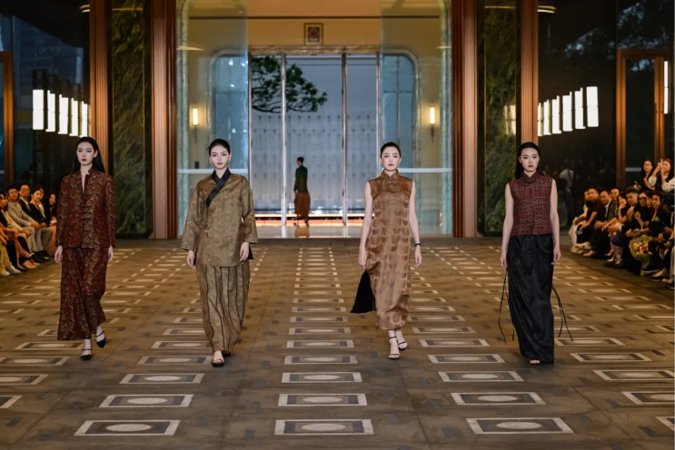 本次活动通过多场古韵与新潮交融的动态发布大秀,向观众展示了香云纱服装服饰产品的创新魅力。金顶奖设计师李小燕携手岭南非遗品牌唐贤香云纱,发布了“种子·向美而生”主题系列作品,以香云纱与现代剪裁手法完美融合,让历经岁月的古老面料,兼具复古韵味与未来时尚质感;新中式国风高端女装品牌曦霖XILIN将千年非遗香云纱化作墨色画卷,以水拓的流动诗意、大漆的沉敛沉淀与极简廓形的留白之美为灵感,在衣衫的褶皱与垂坠间,演绎东方墨色的当代诗篇;霆禧品牌则取东方山水莲荷、传统祥瑞纹样为创作灵感,糅合广绣、织锦等古法手工技艺,将中式立领、盘扣、对襟等经典形制,解构重塑为适配当代审美的宽松利落剪裁,表达香云纱的当代新生与文化传承;深耕香云纱服饰20余年的秀工莨作以“莨作.秘境”为主题,采用健康的熟丝绸前喷技术,参考汉服制式,配以立体剪裁,展现千年香云纱的时尚秘境。