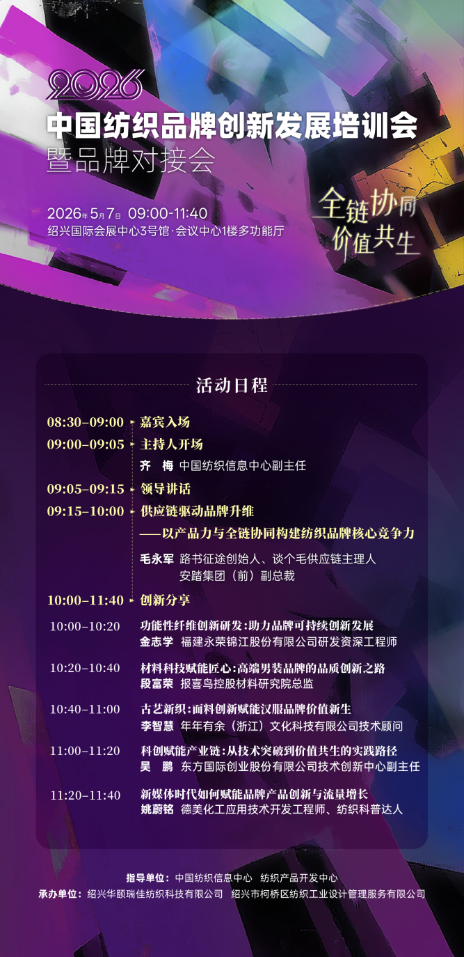 5月7日,以“全链协同·价值共生”为主题的2026中国纺织品牌创新发展培训会暨品牌对接会即将在绍兴柯桥举行。本次会议如同一场关于品牌“生长逻辑”的深度碰撞——将从供应链建设、纤维研发、技术创新、流量增长、品质升级等多个层面,解码新形势下纺织品牌的生存之道与增长密码,为处于转型期的纺织服装企业提供可落地的方法论与思考框架。